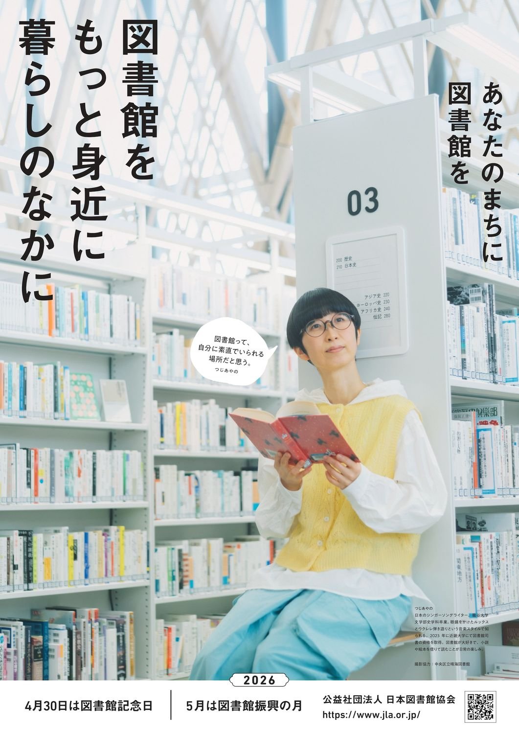 公益社団法人 日本図書館協会は、1972年より続く「図書館振興の月」2026年度キャンペーンポスターに、ウクレレシンガーソングライターの つじあやの を起用する事を発表した。