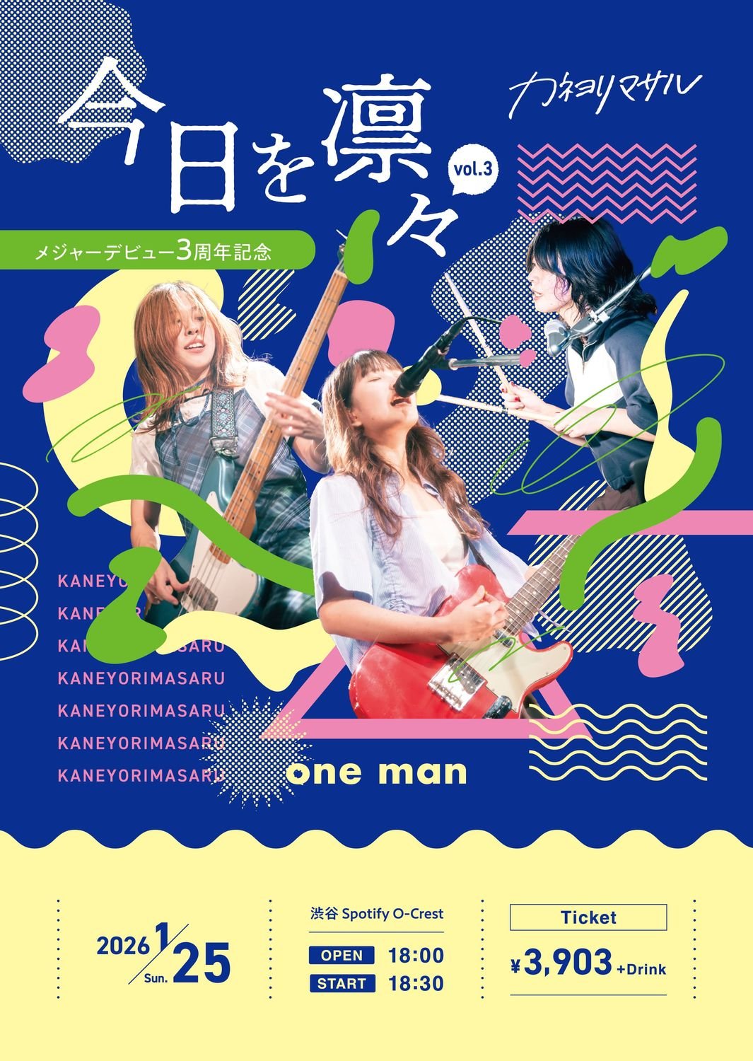 カネヨリマサル デビュー記念日である1月25日に「今日を凛々 Vol3 〜メジャーデビュー3周年記念〜」を渋谷Spotify O-Crestにて開催決定!!