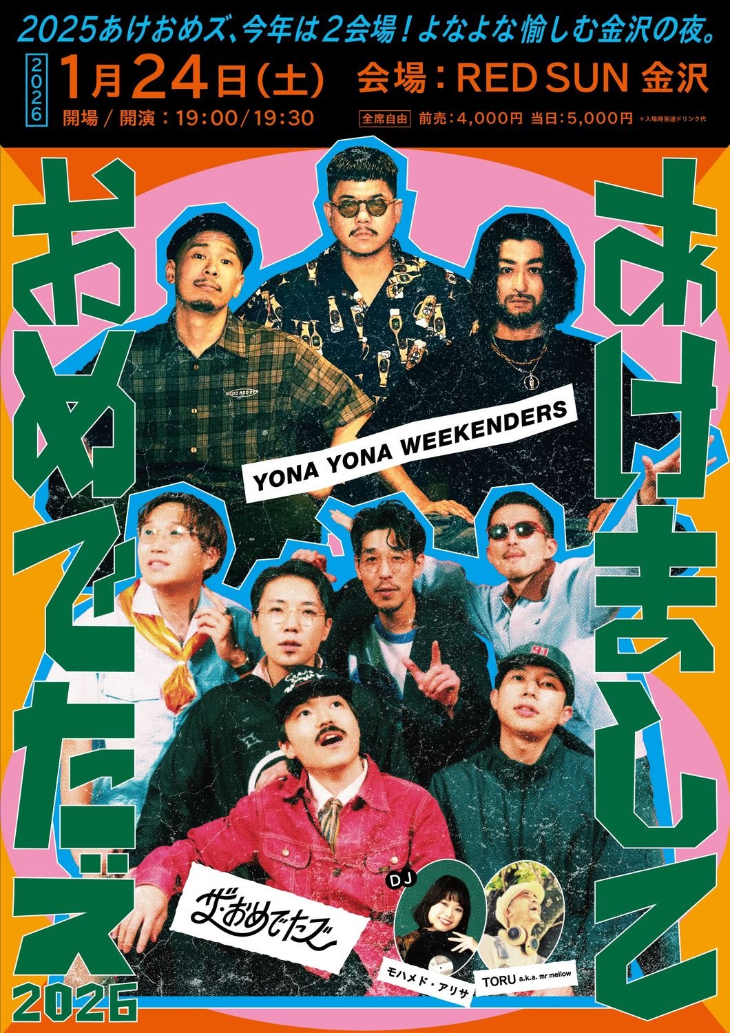 そして、1月24日(土)の石川・金沢 REDSUN公演にはYONA YONA WEEKENDERSの出演が決定!こちらも初共演となり、「あけましておめでたズ 2026」としてザ・おめでたズの結成の地である北陸にYONA YONA WEEKENDERSを招致。こちらも新年の幕開けにふさわしい“おめでたい”ムードを届けてくれる一夜となること間違いなしの顔合わせ。ゲストDJはモハメド・アリサ、TORU a.k.a. mr.mellowが登場する。ぜひ多幸感あふれるスペシャルな一夜を楽しんでほしい。