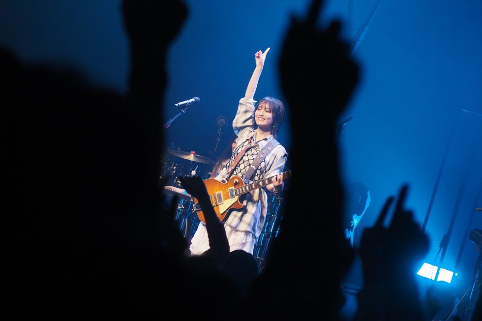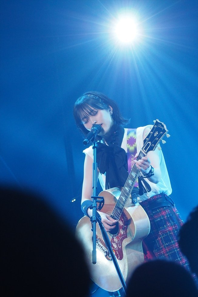続く「君とフィルムカメラ」では、夕陽のような照明とブルーが交錯する。アコースティックギターを抱え、日常の風景をなぞるように歌われるその音が、会場を一気に彼女の描く時間の流れへと引き込んでいった。29日は「yonder」が披露されている。
