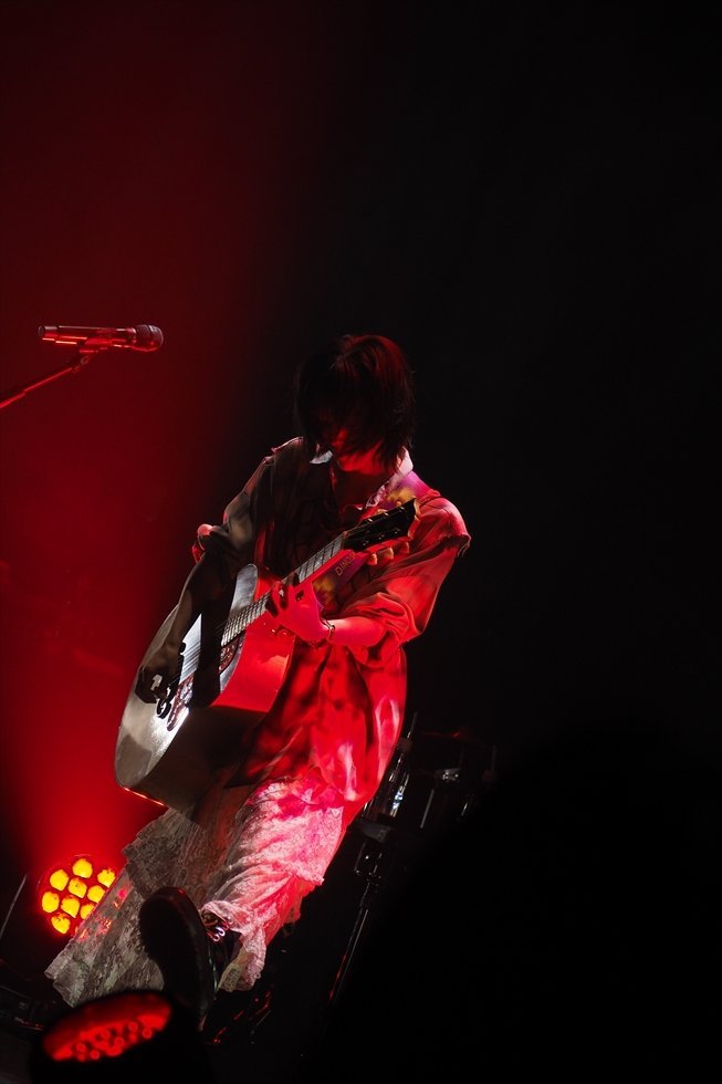 アコースティックギターに山本の歌声、そこへバイオリンの旋律が重なり合い、ステージは赤い照明に染め上げられていく。