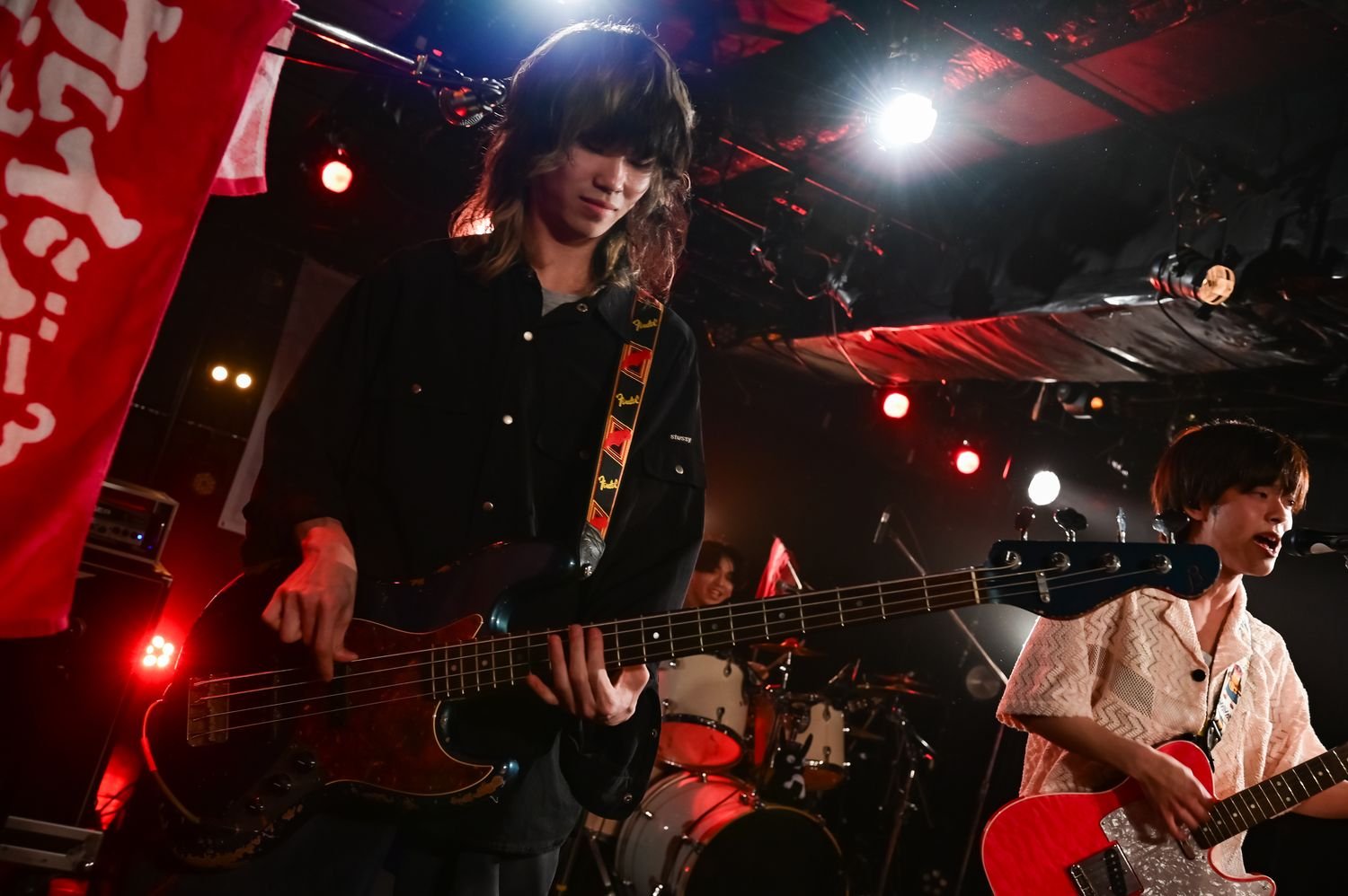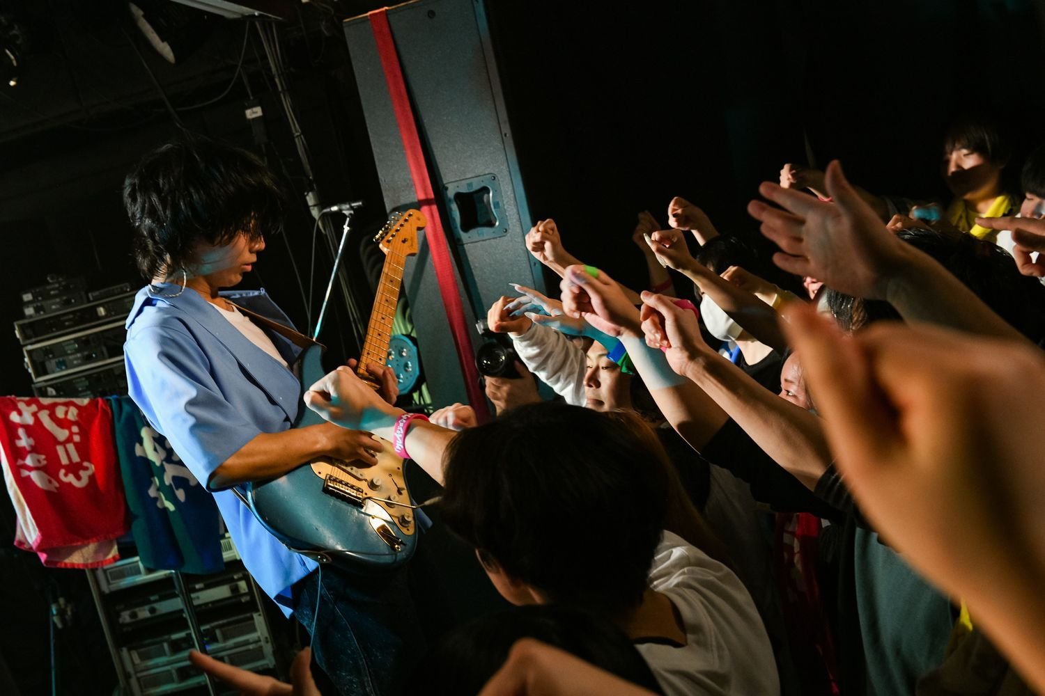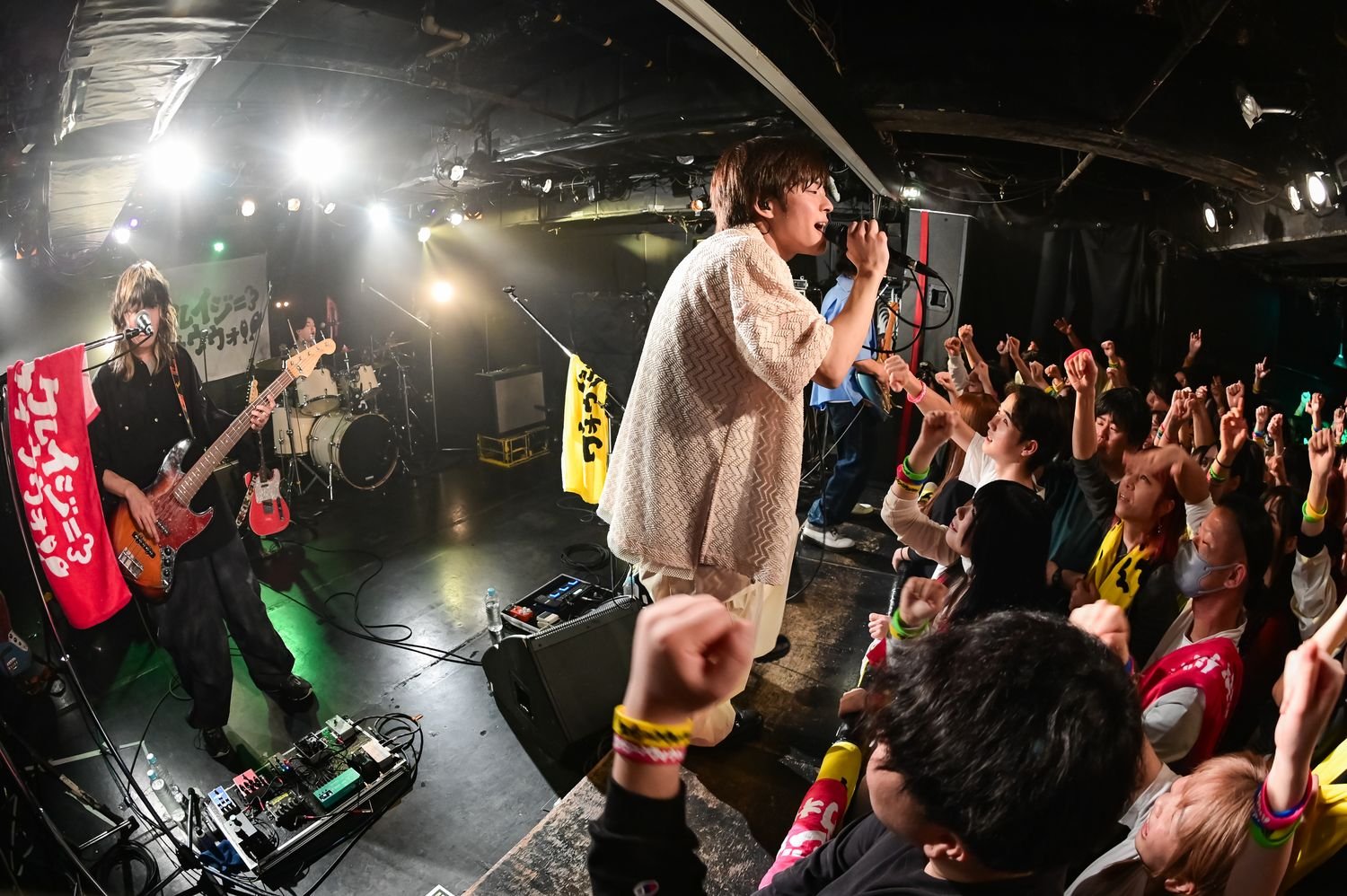 オープニング楽曲は「ヒッサツワザ」。彼らの代名詞となるダンサブルなポップロックサウンドで開演から観客のボルテージを最高潮に上げていく。ミドルテンポのチルソング「So sweet」ではディスコのような照明とともにエモーショナルな時間が流れるなど、楽曲の幅広さで観客のハートを掴む。バイラルヒット中の「トンツカタンタン」では杉村(Vo&Gt)の合いの手に合わせて大合唱が生まれるなど、初ワンマンのハイライトにふさわしいパフォーマンスを披露。その後未発表楽曲「心臓マッスル」「ヒャウィゴ」初披露し、今後のリリースへの期待を煽りながら、アンコールで最新SG「toma」、代表曲「step」と二回目の「トンツカタンタン」で終始観客を踊らせ終演。80分間をフルスロットルで駆け抜け、初ワンマンにふさわしいアイコニックなライブになった。