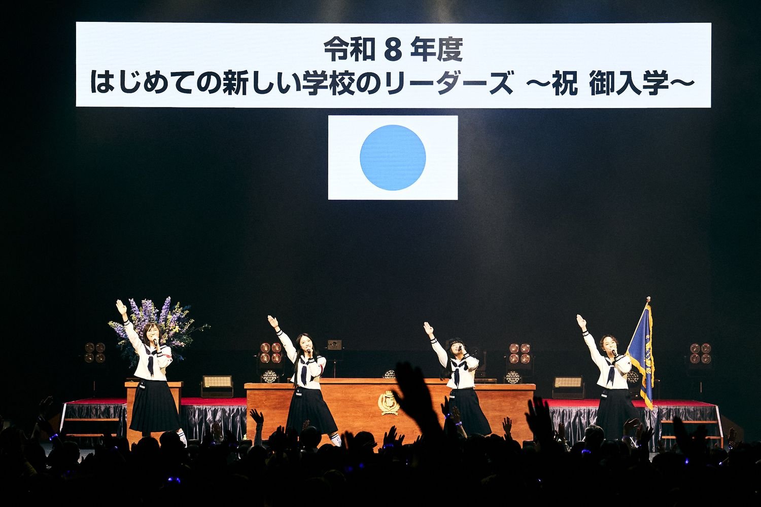 定刻、会場に無機質なブザーが鳴り響き、マネキンスタッフによる「ただいまより、令和8年度 はじめての新しい学校のリーダーズ 〜祝御入学〜入学式を挙行いたします。皆様、大きな拍手でお迎えください。」というアナウンスが流れると、客席扉から「本学の代表」として新しい学校のリーダーズの4人が登場。客席の間を縫ってステージへと向かう姿に、会場のボルテージは早くも急上昇する。