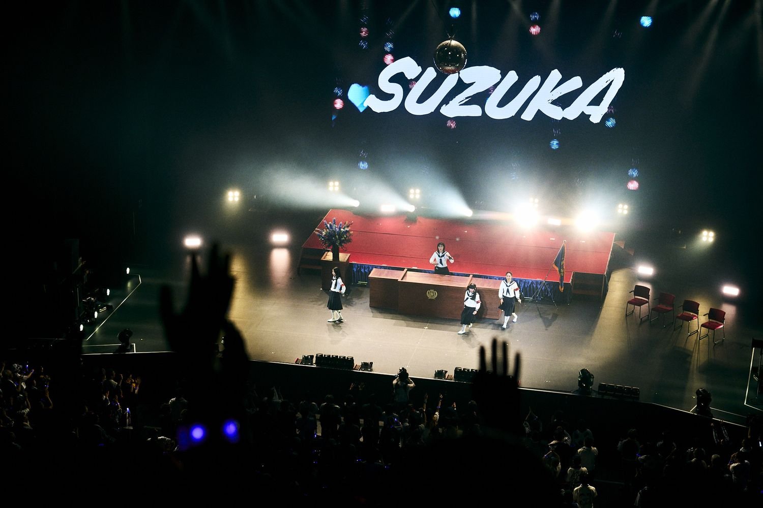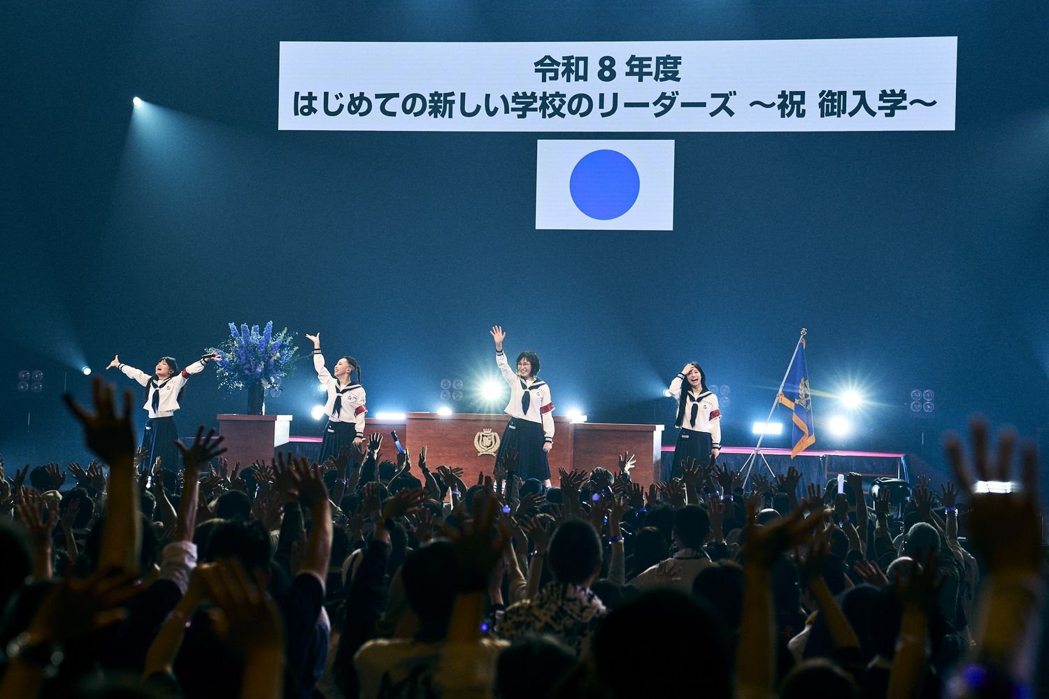 さらに会場を驚かせたのは、「来賓紹介」だ。テレビ朝日ミュージック、アソビシステム、TWIN PLANETという、彼女たちの歩みを支えてきた所属事務所3社の重役陣が来賓として登場するという演出に、客席からはどよめきと歓声が沸き起こった。メンバーからは「改めてご入学おめでとうございます!新入生には本校を知っていただき、在校生には改めて魅力を感じていただけたらと思います!全員全力で楽しむ準備はできていますか!」と、新旧の生徒たちそれぞれに向けた愛のある歓迎の言葉が贈られた。