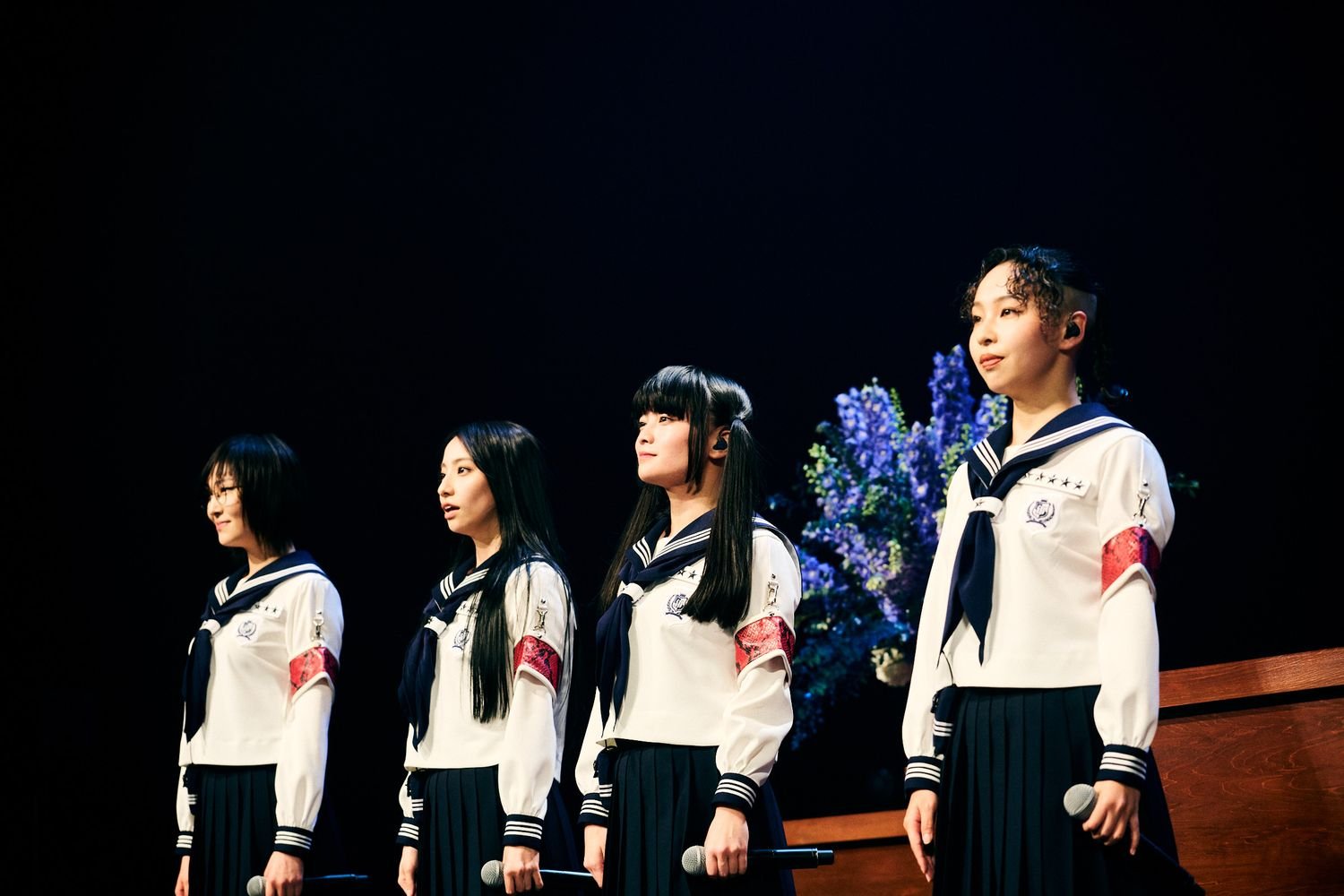 続く寸劇では、MIZYUが「あの日のマラソン大会、一緒に走ろうねって誓ったのに…」と裏切られた切ない気持ちを作文で朗読。すかさずKANONが「この儚い気持ちを、必要以上に壮大に表現した曲を披露させて頂きます」と見事なフリを入れ、「キミワイナ’17」へ繋ぐ。彼女たちらしいシュールな笑いと、圧倒的な表現力のギャップが光る。さらに寸劇を挟み、「恋の遮断機」「恋ゲバ」「知りたい」と、学生生活に付き物の複雑な恋愛模様を情感たっぷりに歌い上げた。