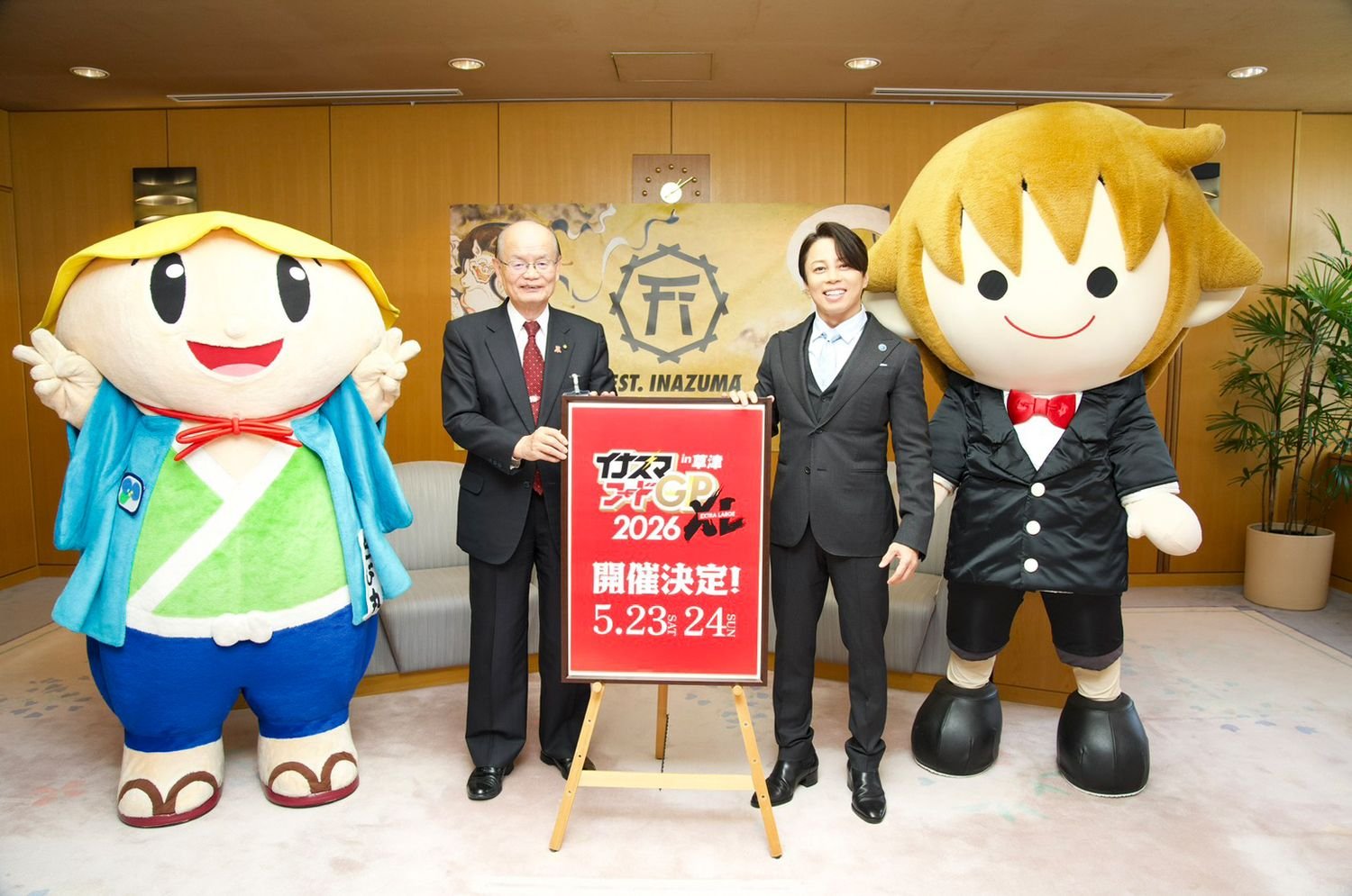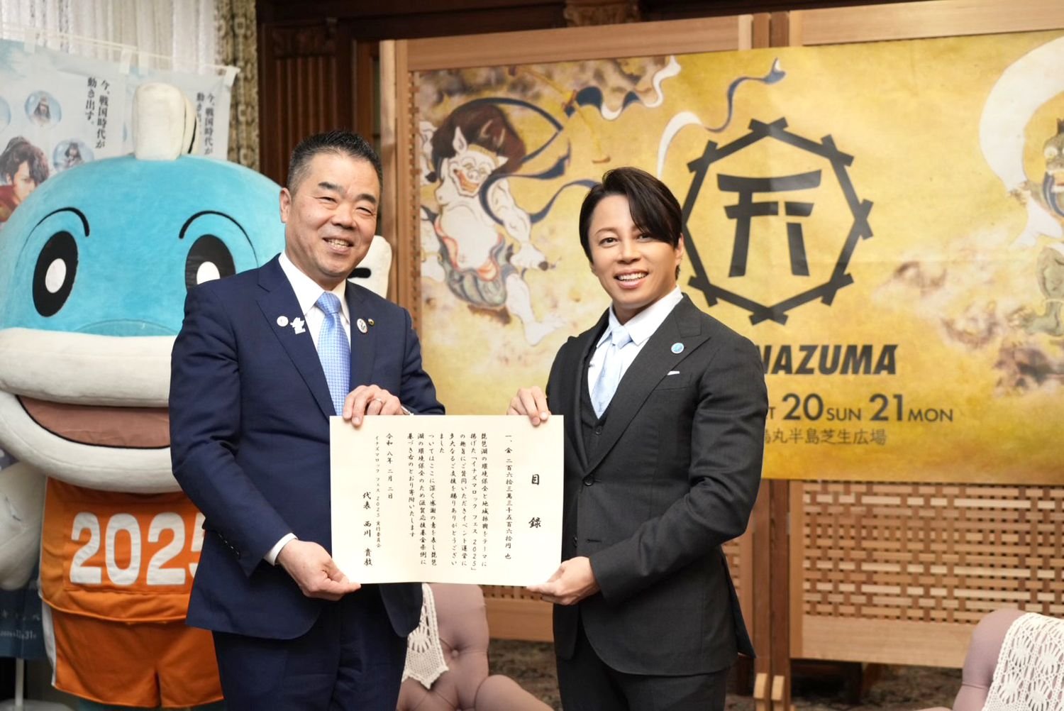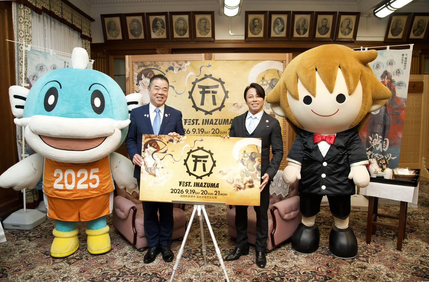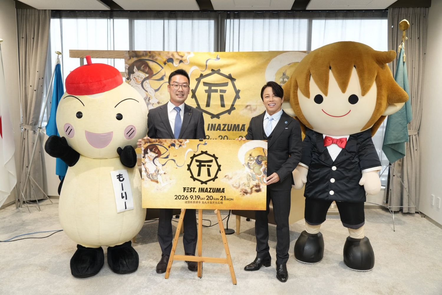 ほかにも、滋賀県ではキャラクターを活用した観光振興と魅力の発信を図るため、新たに滋賀県観光PRキャラクター制度が創設されることも明らかになった。その第一号として、西川貴教のキャラクター「タボくん」が “滋賀県観光PRキャラクター”に委嘱された。三日月知事は、「タボくんにも観光キャンペーンに登場してもらって、滋賀のいいところや『FEST. INAZUMA』をご紹介いただきたい」と期待を寄せた。