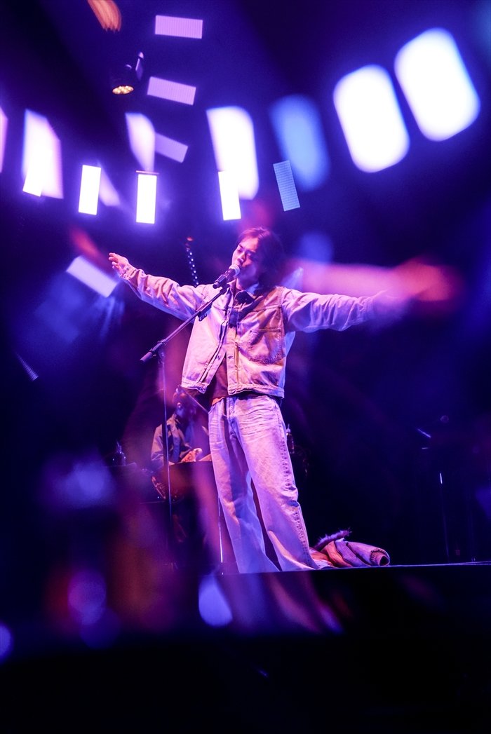 中盤のMCを挟み、菅田があいみょんとのコラボ楽曲「キスだけで」をタイトルコールすると、会場からはどよめきが起こる。ソロアレンジによるパフォーマンスで、男女の機微を繊細な歌声で見事に表現した。続いて披露されたのはEPのリード曲「Sensation Season」。バンドマスター・西田修大(Gt.)とともに制作された、菅田の“今”が詰まったエモーショナルな一曲に、会場は静かに聴き入る。