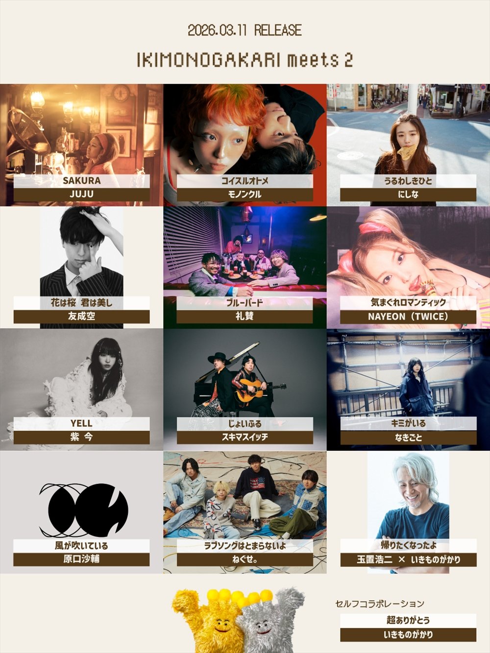 JUJU、モノンクル、にしな、友成空、礼賛、NAYEON(TWICE)、紫 今、スキマスイッチ、なきごと、原口沙輔、ねぐせ。、玉置浩二の計 12 組の参加が参加する「いきものがかり meets 2」。