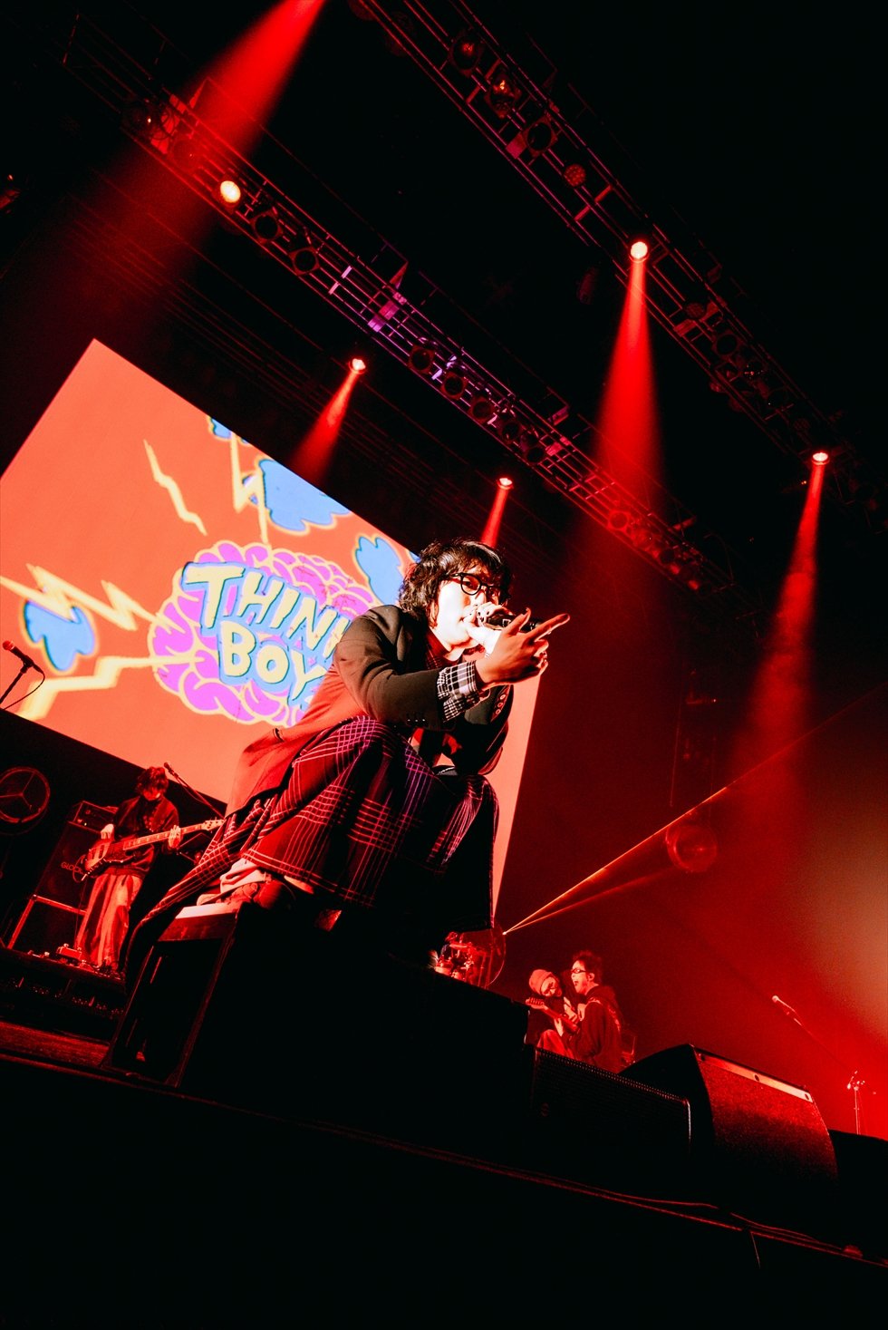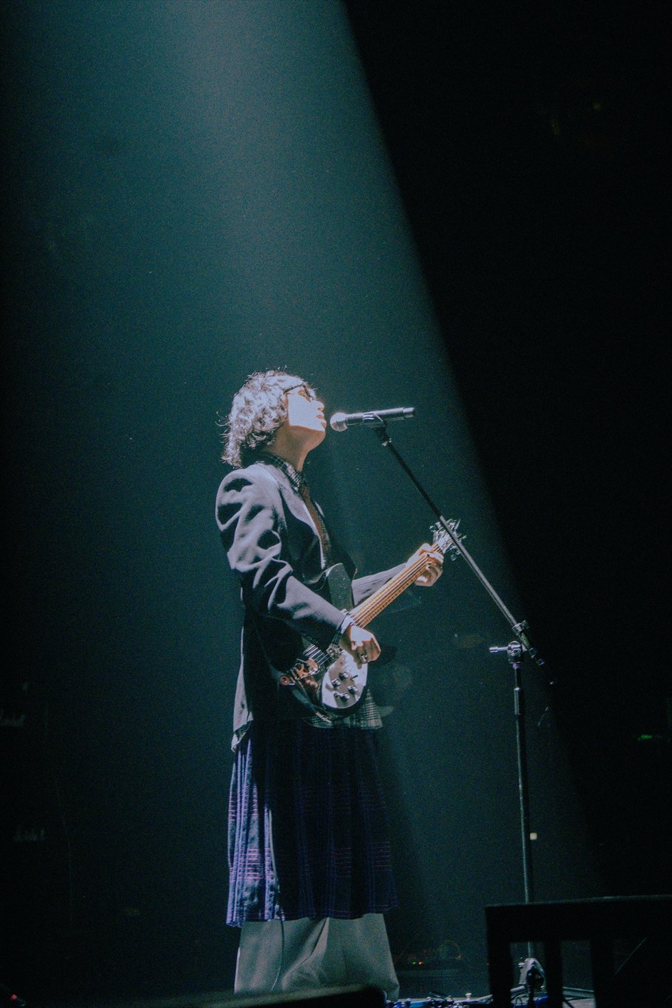 「永遠の少年」がハイライトだろうか。「音楽が鳴った瞬間にグッと強くなったような気がする。マリオだったらスターを取ったような、どこまでも行けるような気持ちになる」と告げてサビの一小節だけを先に歌ったのは、ここに今の彼の主張があるからではないだろうか。<今夜僕らだけが正義さ><きっと僕らは幸せになれる>ーーポジティブなエネルギーを感じる疾走感のバンドサウンド、感情を爆発させるようなボーカル、スクリーンに象られる星々......まさにスターを取って虹色の身体で爆走するようなパンキッシュな演奏である。