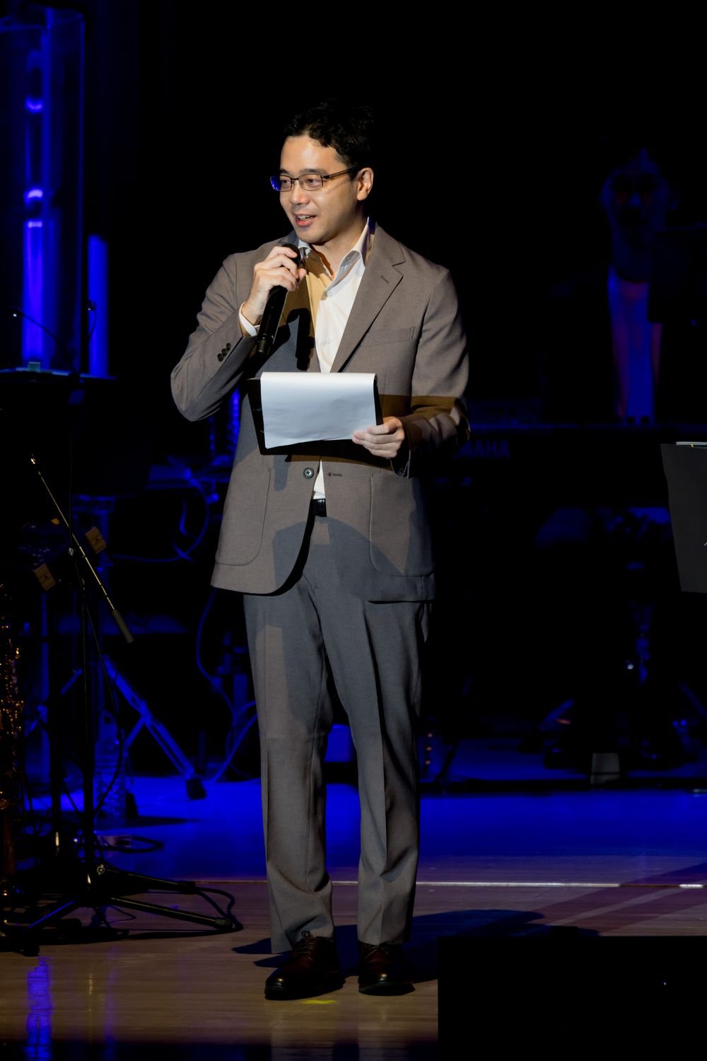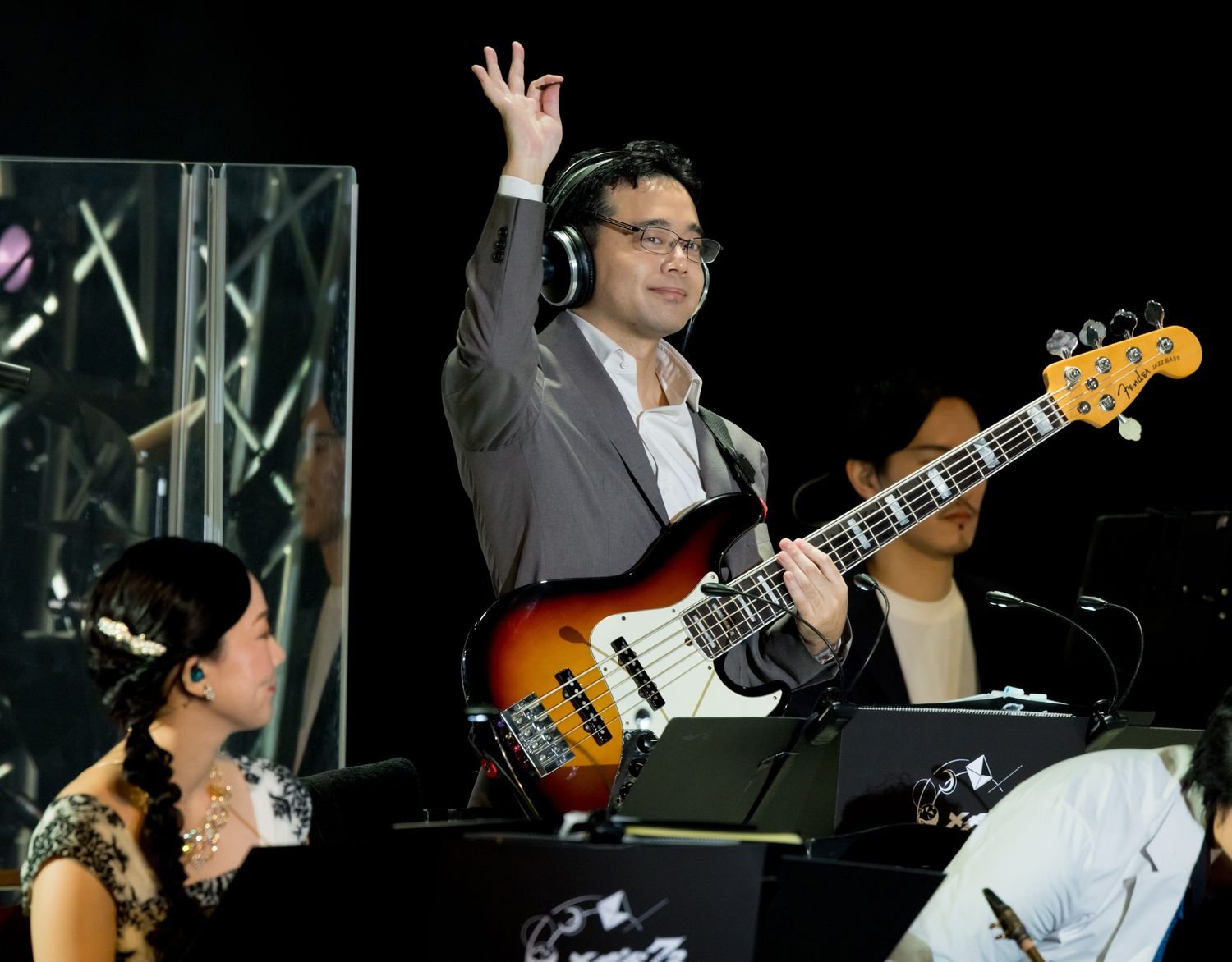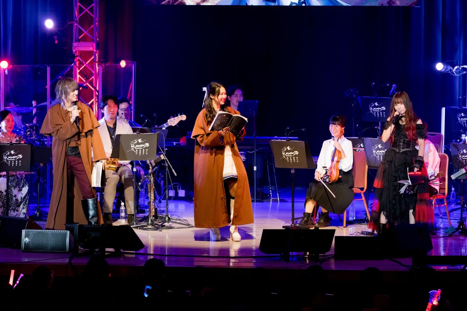楽団が「ヴァイガルド防衛線」「孤独を繋ぐナキ声」と一糸乱れぬ演奏で美しくも悲しみも滲んだ大海原を表現すると、アウトロの波の音から再び朗読パートに入る。西田とバトリが演じるメギドと、朝霧演じるバールベリトとのバトルシーンだ。バトリによるクオリティの高い謎かけやユーモラスな台詞回しと演技に会場からは笑いも零れ、公演は和気あいあいとした空気のなか進む。そして再びインストメドレーに突入すると、疾走感のあるアッパーな「老獪な逆月」、感傷的かつ情熱的なムードからたおやかで内省的な音世界につないだ「彼の世界~幸福の在り歌」、アッパーで凛とした「孤高に咲く蒼玉」、ポジティブな空気が漲る「彼からの呼び声 ~THE HERO」と瑞々しい演奏で情感豊かな物語を立ちのぼらせた。