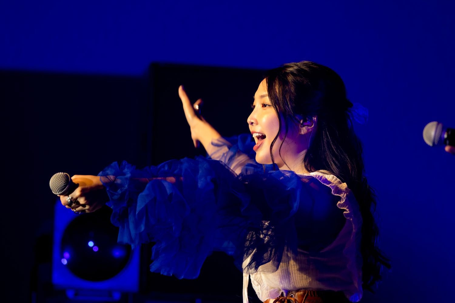続いて登場したのは朝霧演じるバールベリト。「お前らまだまだいけるよな? 明日に(体力を)残すんじゃねえ。全部よこせ!」と会場を焚きつけると、ジャズナンバー「ゲェム愛者の狂想曲」をしゃがれ声でパワフルかつ妖しく歌唱する。その後は生田演じるアスモデウスが「貴様ら、宴の時間だ!」と景気をつけて、「Burning in chaos」を艶やかかつサディスティックなボーカルで彩った。彼女は歌唱後もアスモデウスとして「フォトンよ鳴け、輝け!」と客席を沸かす。物語に登場する4人のキャラクターとのコミュニケーションを存分に愉しめるセクションだった。