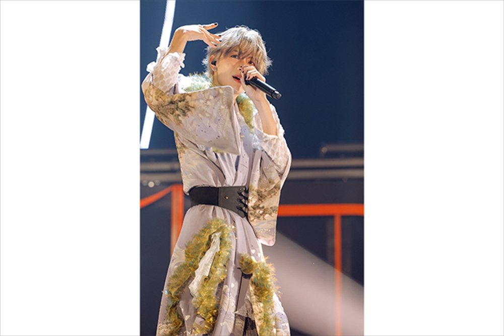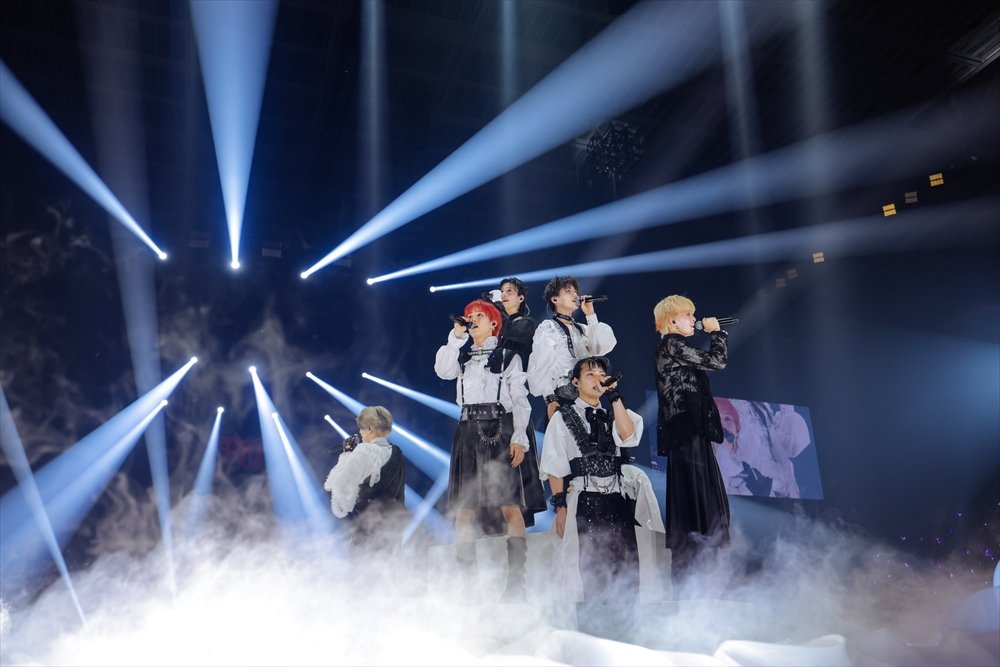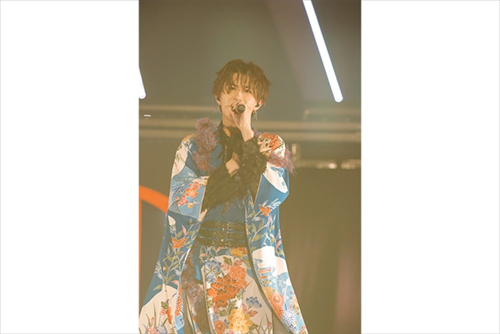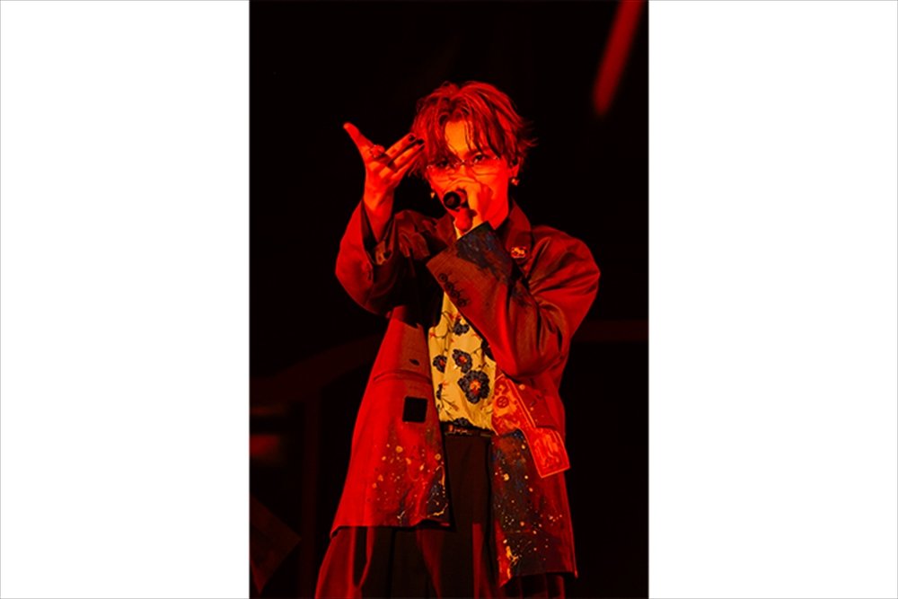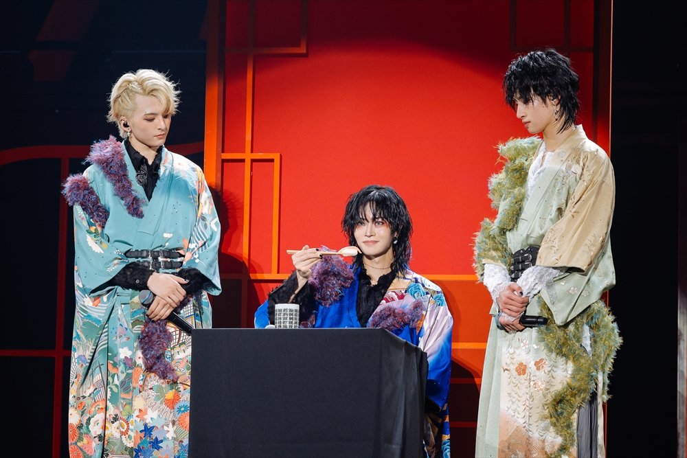 2日間ともに披露されたのは、メンバーが振り付けをしたSEのダンスだ。時に無音になり足音だけになる瞬間や、物語を感じさせるパフォーマンスに息をのむ。さらに、彼らのライブの魅力である、シネトリカルな演出を使ったステージでは幻想的な世界観でしっかりと歌声と楽曲の物語を聴かせていく。それぞれが違った声質を持つ歌声だからこそ深みを感じさせる『RONDO』や『零零』で心を掴み、彼らと親和性が高い“和”のステージでは、KEIGO、KENT、侑暉が和傘などを使った舞で魅了し、扇子を巧みに使いこなした『禁句』や、齋木春空の口上から始まるライブでの定番曲『SEAFOOD』を、SとRay、春空の3人で“寿司取り合戦”を入れ込みながら魅せたり、SとITARUで和装をひらめかせながらパワフルに『猟犬』で吠えたりする姿を、来場者全ての人の目に、強く焼き付かせた。