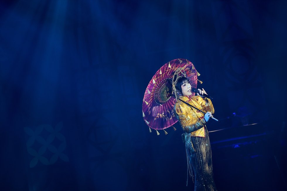 続くCHINESE SOUP」(3rd AL「COBALT HOUR(コバルト・アワー)」/1975年6月20日発売)では軽やかなリズムと遊び心が顔を覗かせ会場を沸かせた。中盤、「残暑」(22th AL「天国のドア」/1990年11月23日発売)、「たぶんあなたはむかいにえに来ない」(荒井由実2nd AL「MISSLIM(ミスリム)」/1974年10月5日発売)ではオリエンタルなモチーフの傘を巧みに、そして妖艶に操り、楽曲の世界観をより深めた。