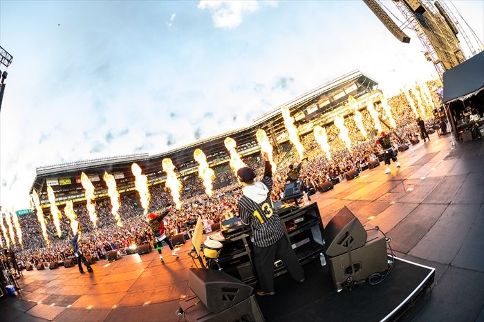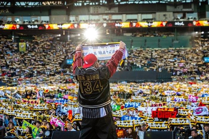 開演前から、湘南乃風のセレクターを担うThe BK SoundがアッパーなサウンドとともにMONGOL800のKIYOSAKUから預かった熱い歌のエールのダブを届け、マーチングバンドによる演奏で満員御礼の会場の期待値はさらに急上昇。炎の特効もろとも1曲目の「SHOW TIME」からせきを切ったように盛り上がり、「Joker」では早くも甲子園を埋め尽くしたタオルが回る。その圧巻の景色を前に若旦那が「今日は無礼講だぞ、周りに関係なく踊れよ!」とあおり、RED RICEは「最高の舞台、甲子園にやっと立てたよ。これからもぶっ倒れるまでお前らの心に向けて歌い続けるぞ!」と宣言。曲を重ねるごとにオーディエンスの熱量は上がる一方だ。