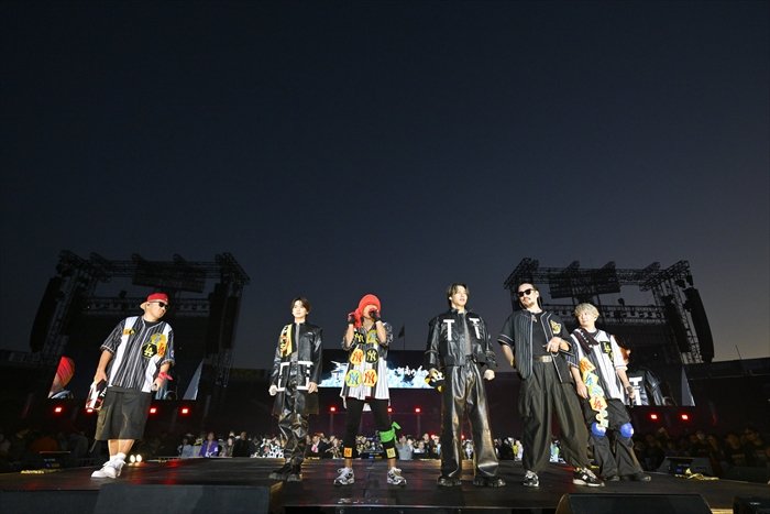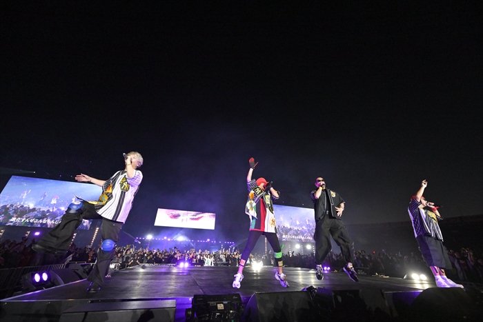 続いて、THE RAMPAGE from EXILE TRIBEのRIKUと吉野北人が客席をかき分け、センターステージへ。体調不良のため惜しくも出演キャンセルとなった川村壱馬の分まで、「自由への大脱走 ~Running Running Running~ feat. 湘南乃風」で熱狂の渦を巻き起こす。同日にEXILEの福岡公演があるにも関わらず駆け付けた2人に闘魂を注入された湘南乃風は、よりライブ映えするハイボルテージなナンバーを連発する。