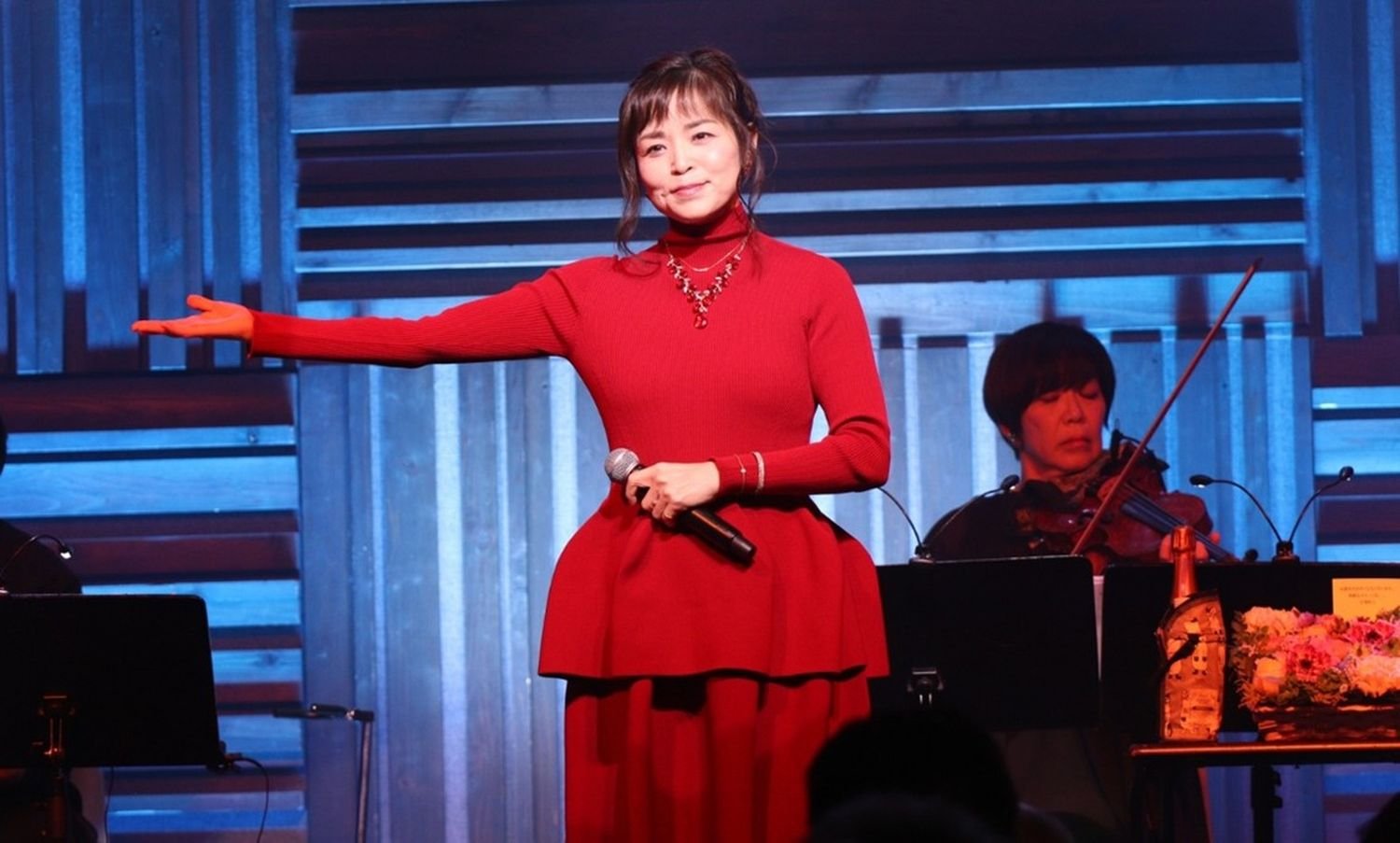 ライブの幕開けは、赤い衣装で登場し、オリジナル・ヒットシングル「三日月情話」「桟橋」「みれん酒」の3曲を立て続けに披露した。二胡やヴァイオリンのイメージが強い「三日月情話」は、ギターサウンドが印象的なアレンジに様変わり。また、代表作「みれん酒」は、スローテンポでアコースティックな雰囲気で、まったく新しいアレンジになり「この形で再び発売したいほどお気に入りです」と笑顔で語った。