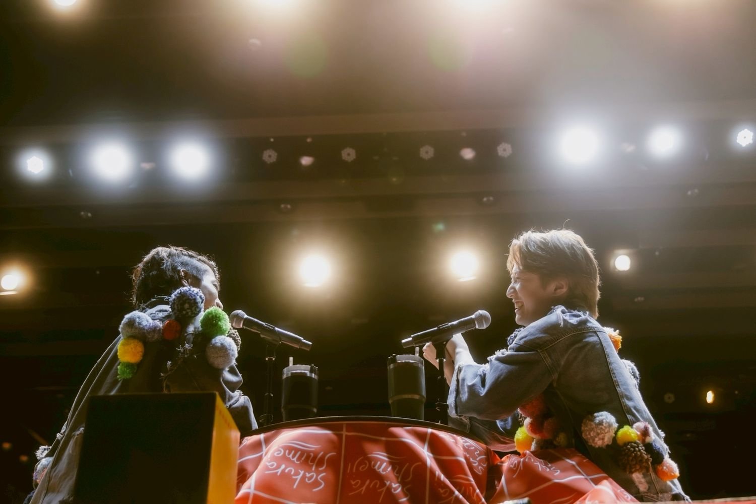 チケットソールドアウトを喜びながら、『きのこりあんの集い』に初めて来た人が多いことに驚いていた雅功と彪我。2025年の精力的な活動が新たなファンとの出会いをもたらしたのだろう。そして長く応援してくれているファンにも見守られながら、2人はすっかりリラックスしている。観客に普段よりもアットホームなライブだと説明しながら、「和気あいあいと楽しんでいただければ」と伝えると、ステージに置かれたこたつに入った。