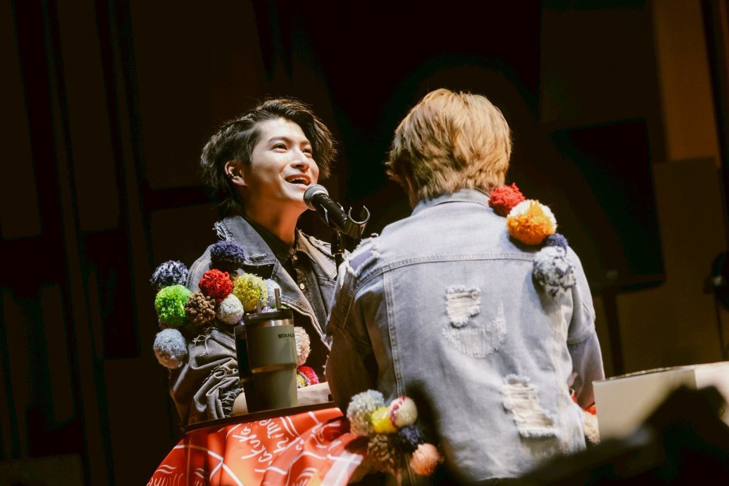 記念すべき10回目の開催ということで、雅功と彪我は、“原点回帰”がテーマのコーディネートで登場。色とりどりのボンボンが目を惹く1部の衣装は、スタイリストによるハンドメイド品。2人が中学3年生の時、2016年に開催したワンマンライブ『おたまじゃくしの宴』の衣装を彷彿とさせるデザインだった。2部での2人は、『きのこりあんの集い vol.1』と同じく、赤と黒のニット帽を被って登場。さらに、スタイリストによってカラフルなしっぽもつけられた。