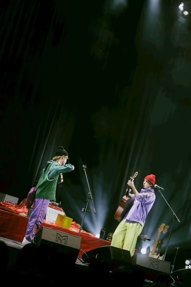 「今年の顔」として披露されたラストナンバーは、『唄うこと、謳うこと』のリード曲「ガラクタ」。〈その憂いも理想も戸惑いも全部/綴って/紡いで/君と歌いたいんだよ〉という決意を会場に響かせた。2人は、最後に書き初めを披露。「今年の総括」をテーマとした1部では、彪我が今年の活動を「戦い、そして分かち合い。」と凛としたフレーズで表した。雅功はユーモアを交えた書き初めで会場を笑わせながら、一人暮らしを始めた今年の生活の大変さを語った。2部の書き初めのテーマは「来年の抱負」。雅功は「定期的に美容室へ!!」、彪我は「髪を染めて、ヤンチャッチャ。」と2人ともヘアスタイルに関する抱負を掲げ、驚きのシンクロを見せた。そして2人は「よいお年をー!」と声を合わせてイベントを締めくくった。