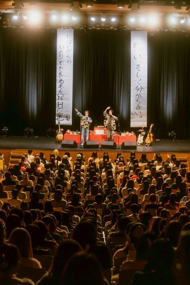 ここからは、こたつでくつろぎながらトークを展開。開演前に観客に回答してもらったアンケートを元に談笑した。2人は観客から寄せられたメッセージに声を上げて笑ったり、しみじみと共感したり、時に鋭いツッコミを入れたりする。日常の延長線上のような2人の飾らないやりとりに、会場は穏やかな笑いに包まれた。