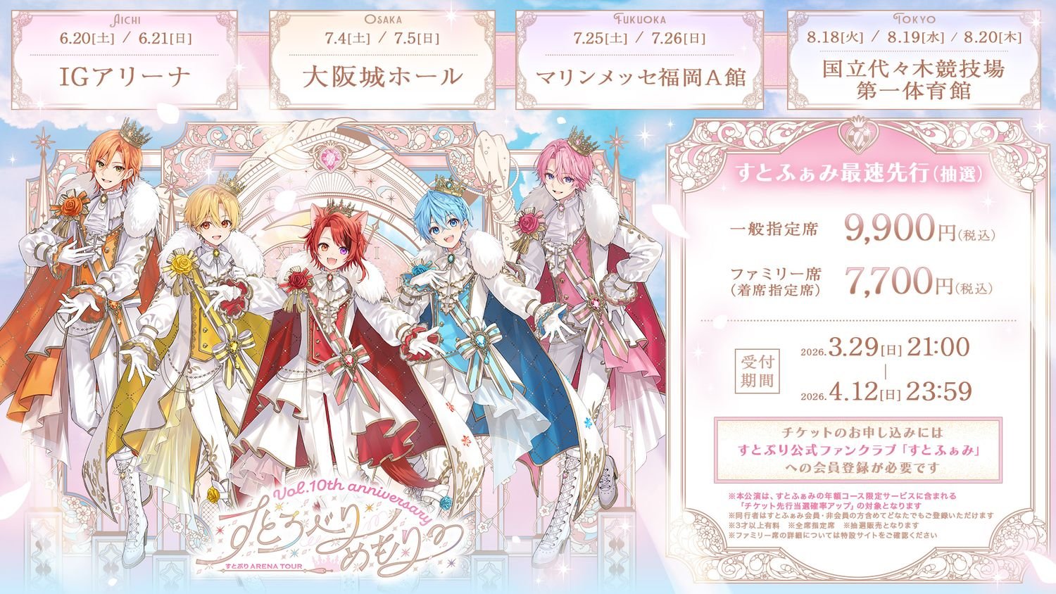 株式会社STPR(本社:東京都渋谷区、代表:柏原真人、以下「STPR」)は、当社所属の2.5次元歌い手アイドルグループ「すとぷり」が2026年6月4日に結成10周年を迎えることを記念し、東京・愛知・大阪・福岡の4都市を巡るアリーナツアー「すとろべりーめもりー Vol.10th anniversary ~すとぷり ARENA TOUR~」を開催いたします。本ツアーのチケットは、2026年3月29日(日)21:00より、公式ファンクラブ『すとふぁみ』最速先行(抽選)にて申込受付を開始いたしました。