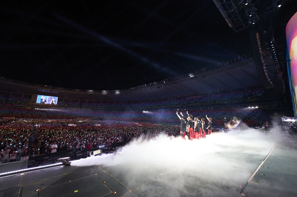 ラストの曲に入る前のMCで、岩田は「スタジアムを埋めてくださるMATE、皆さんが僕たちの誇りです!」と感謝を告げた。「みんなが虹のように離れないでいてくれたからこそ、今日があったんだなと思います」とØMIが語り、スタジアムライブのラストを飾ったのは「RAINBOW」。メインステージ中央に固まった7人は、肩を組んだり互いに顔を見合わせたりしながら、真っ直ぐに歌を届けていく。最後のワンフレーズを歌い上げたところで、MATEのライトスティックが七色に輝き、スタジアムに大きな虹が架かった。