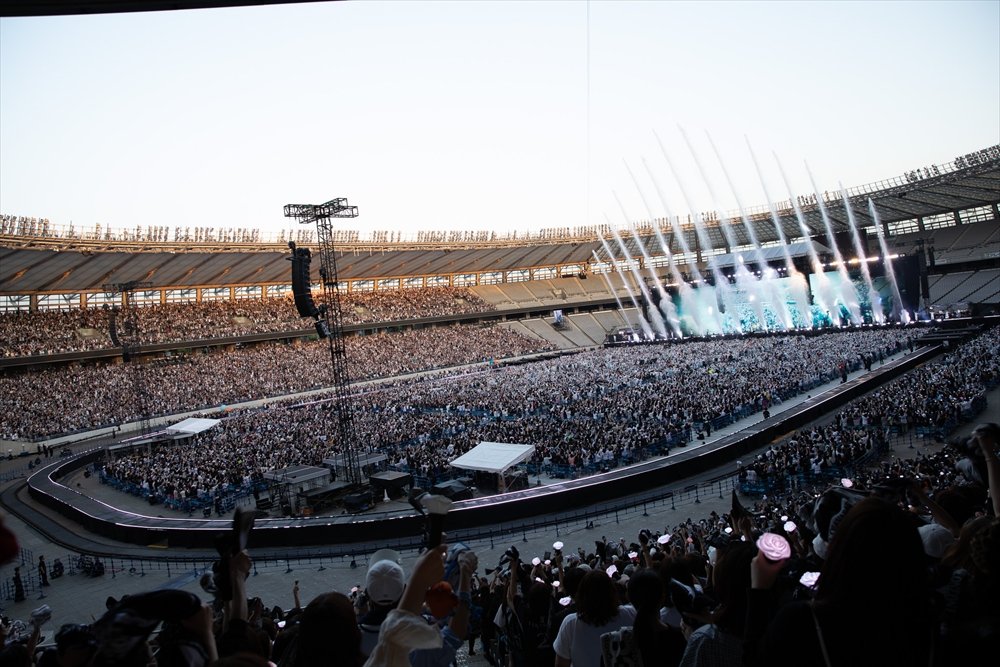 「LET'S PARTY」からはムービングステージで会場の奥まで向かい、「JSB Blue」で青空に突き抜けるような爽快なサウンドを届ける。「Welcome to TOKYO」「FIGHTERS」「1st Place」を経て、「Feel The Soul」では青空の下に響く約5万人のシンガロングを受けながら優しい眼差しを向ける7人。メインステージでは「J.S.B.」と書かれた青いフラッグが振られ、カラフルなバルーンがアリーナを弾む。「(YOU SHINE) THE WORLD」ではMATEのタオルが勢いよく回され、大阪公演に続きウォーターキャノンが噴射。スタジアム公演ならではの大迫力の演出の数々で会場のボルテージを引き上げた。