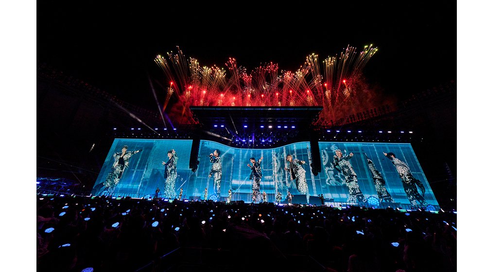 フロートでアリーナ中央へと向かった7人は「MUGEN ROAD」「Feel So Alive」と畳みかけた後、15年の軌跡を辿るような怒涛のメドレーを投下。「Summer Madness feat. Afrojack」「Share The Love」「SPARK」「Waking Me Up」「Movin' on」と続き、「HAPPY」ではステージにメンバーキャラクターの着ぐるみが登場した。「君の瞳に恋してる -Can't Take My Eyes Off You-」では再びカラフルなバルーンが会場を彩り、MATEたちを躍らせた「Rat-tat-tat」から、メドレーのラストは「STARS」。そこから繋がれたのは、グループの代表曲のひとつ「R.Y.U.S.E.I.」だ。「この日まで待っててくれてありがとう!MATE!」とØMIが叫び、打ちあがる鮮やかな花火とともにライブはクライマックスを迎える。ステージに立つ7人の姿は星のように煌めいていた。