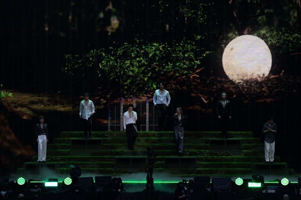 再びステージに7人がそろうと、スクリーンには降りしきる雨の映像が。後半戦の幕開けを飾ったのは、3月にリリースされたミニアルバム『ONE』のリード曲「Through The RAIN」だ。この日初披露となった楽曲を通して、7人は「仲間とともにこの先も歩み続ける」というメッセージをスタジアムに刻んでいく。