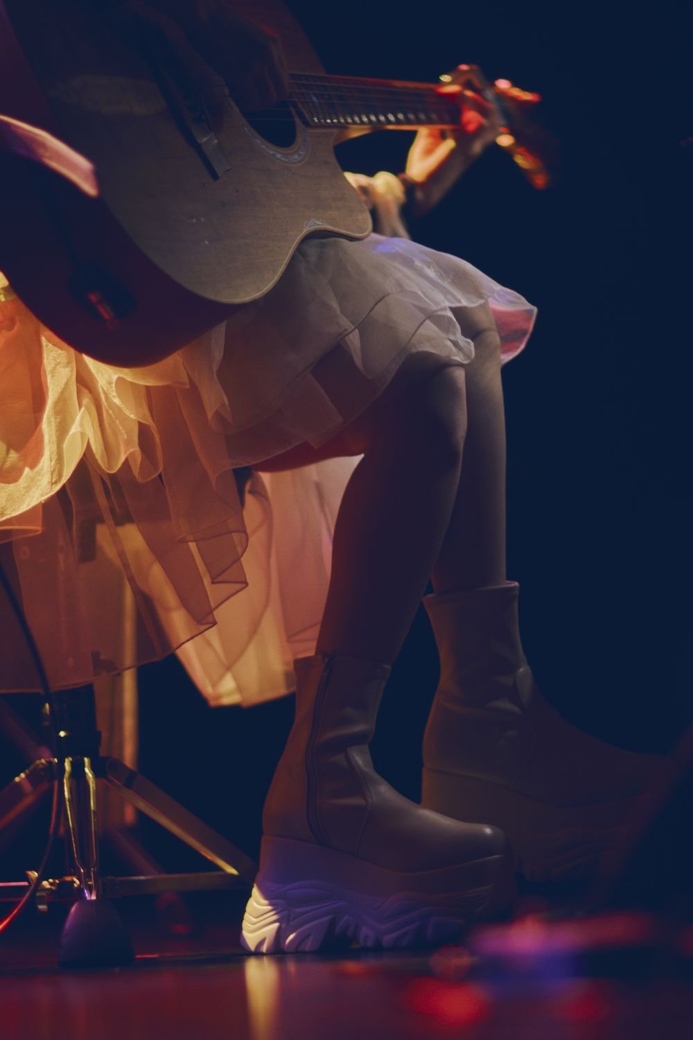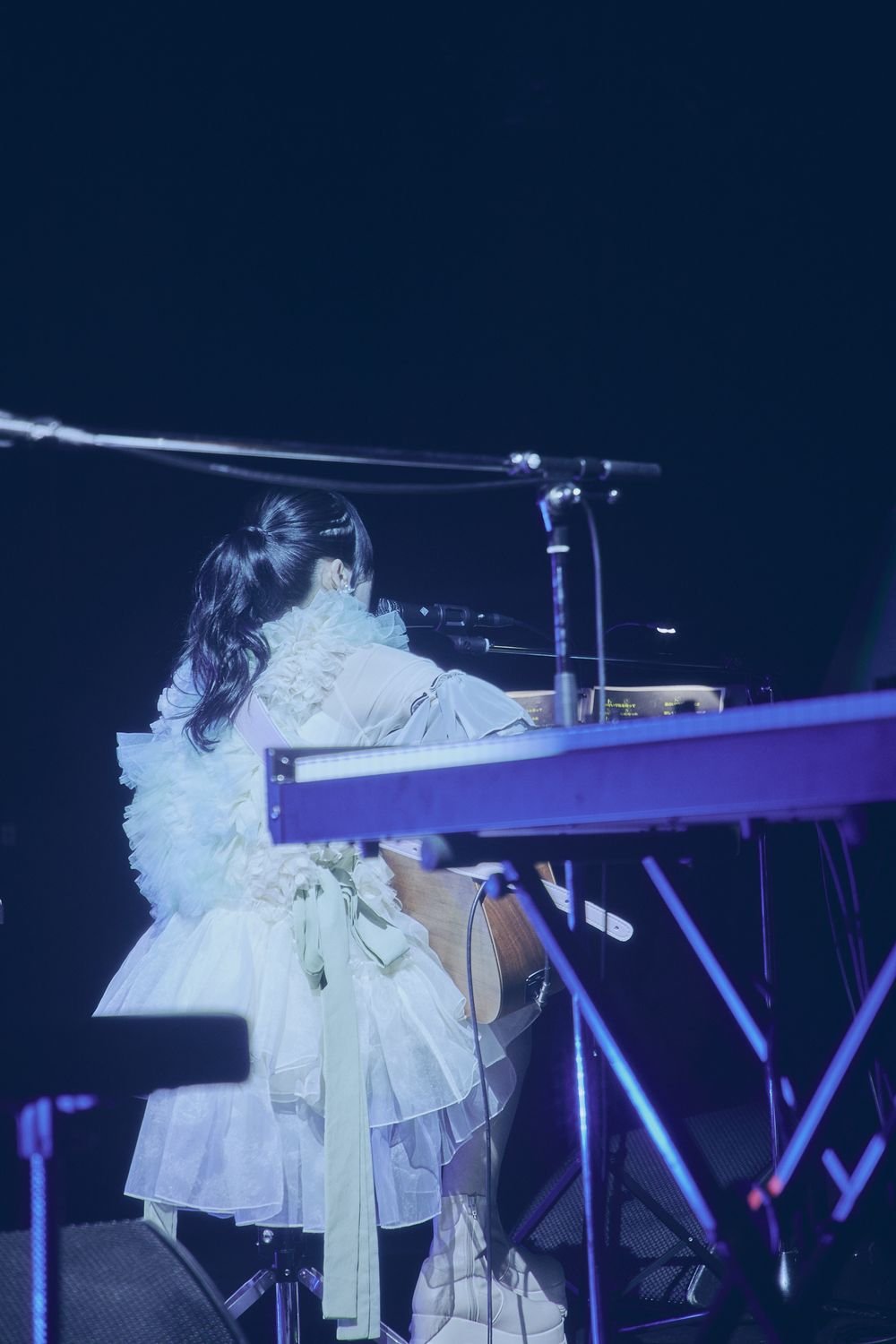 開演の時刻になると、サポートメンバー・竹縄航太と共に、りりあ。がステージイン。そして、竹縄が奏でる清廉なキーボードの調べを受けて、1曲目の「幸せな約束。」からライブがスタートする。りりあ。は、腰掛けながら、一つひとつの言葉を丁寧に歌い届けていく。通常のバンド編成とは異なるミニマムな編成だからこそ、細やかな息遣いや、繊細な声の揺れが、いつも以上にありありと伝わってくる。「ありがとう。」と告げ、続けて同じ編成で「ねえ、ちゃんと聞いてる?」を披露。一瞬のブレイクによって凛と静まり返った会場に、《ねえ、ちゃんと聞いてる?》という切実な問いかけの言葉が鋭く響き、その後、次第にエモーショナルな昂りを見せていく竹縄のキーボードに呼応するかのように、終盤にかけて彼女の歌も熱を帯びてゆく。ここで竹縄がアコースティックギターに持ち替え、「愛とか。」を披露。立ち上がったりりあ。は、アコギの軽快なコードストロークを推進力にしながら躍動感に満ちた歌を届けていき、その上に次第に観客のクラップが重なっていく。逆光で、りりあ。の表情こそ見えないものの、誰よりも彼女自身がめいっぱいこのライブを楽しんでいる様子が伝わってくる。その後、「ここからは、もっともっとクラップいけますか?」「いいね、いいね、そんな感じね。」と呼びかけながら観客に裏打ちのクラップを求め、そのリズムに合わせる形で「素直になりたい子の話。」を歌い始める。観客のクラップに身を任せるようにしながら、元気はつらつな歌を届け、最後に「ありがとーーーーーう!」と力強く感謝を告げフィニッシュ。