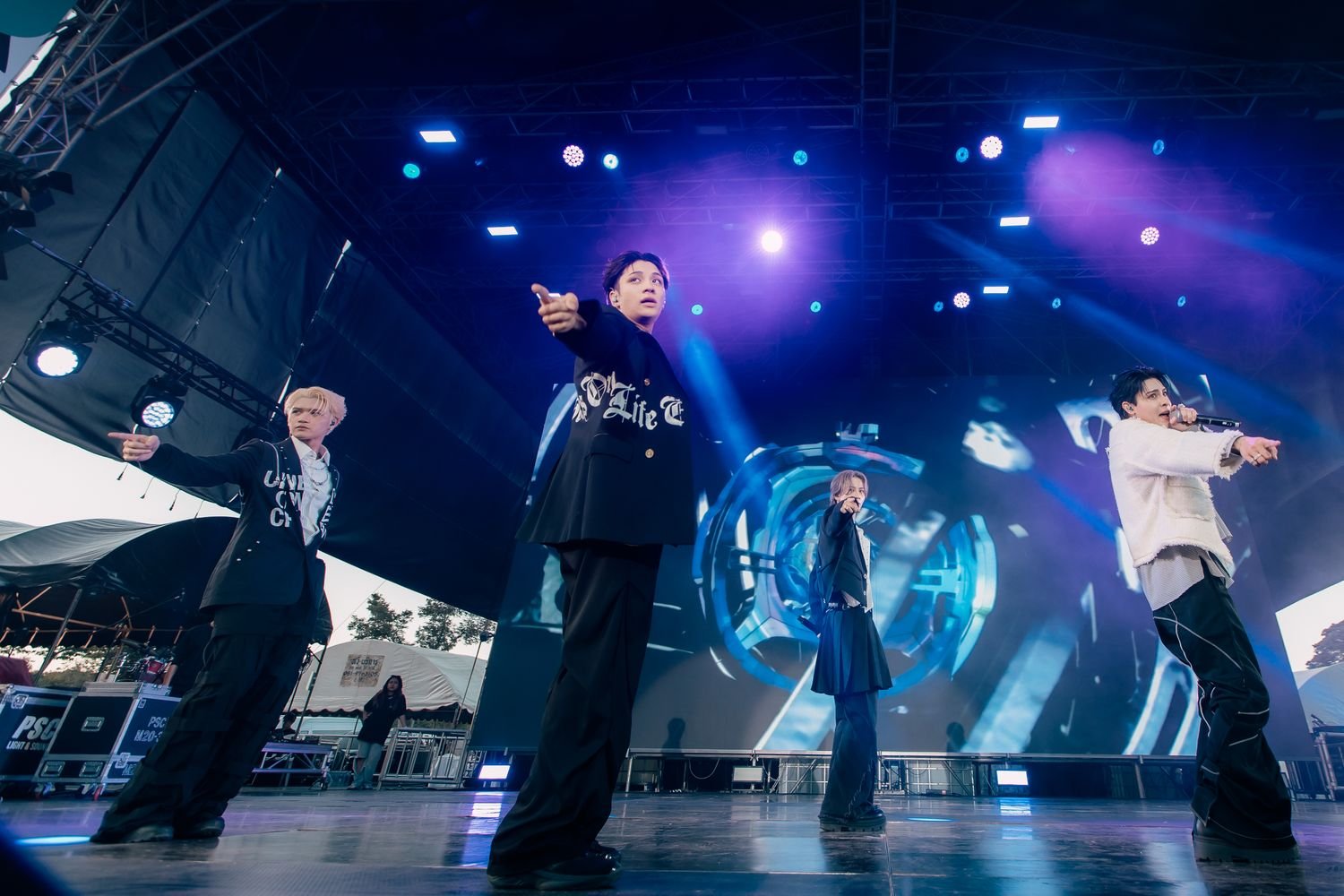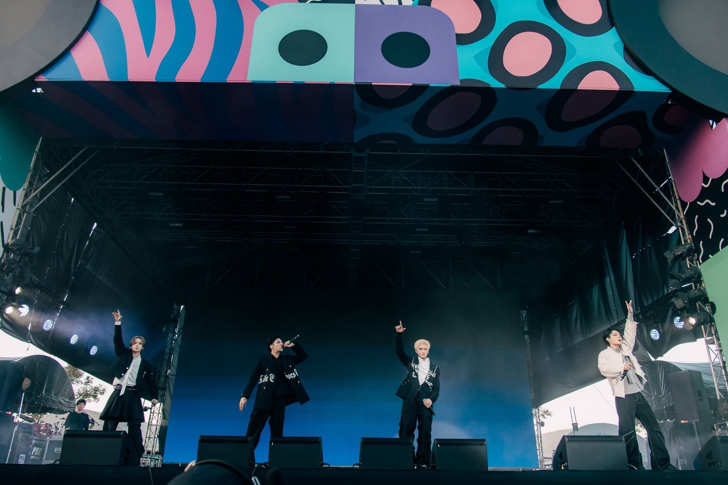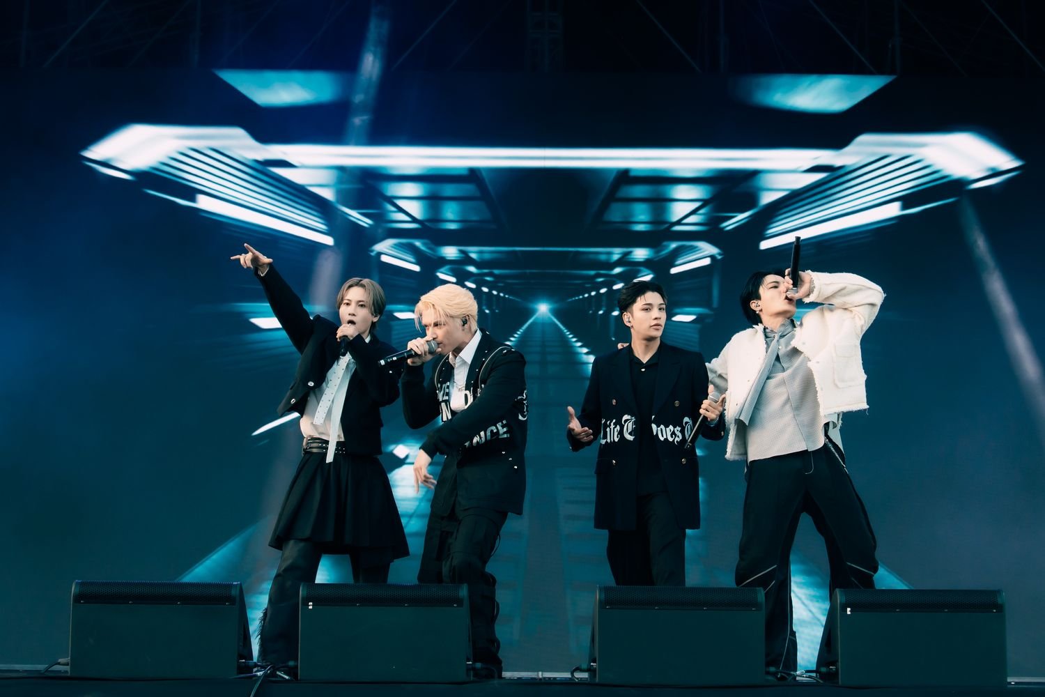 まずはロックテイストの「ROLLIN’ STONES」で堂々の幕開け。彼らの武器である力強いコーラスワークとキレのあるラップが、序盤から圧倒的な存在感を放つ。4 人の声が重なった瞬間には完璧なバランスが生まれる。