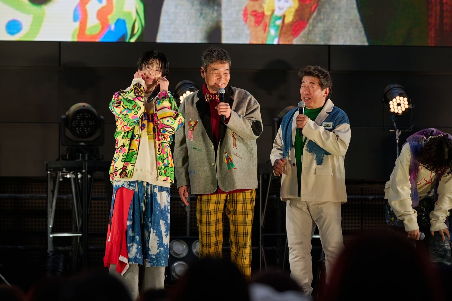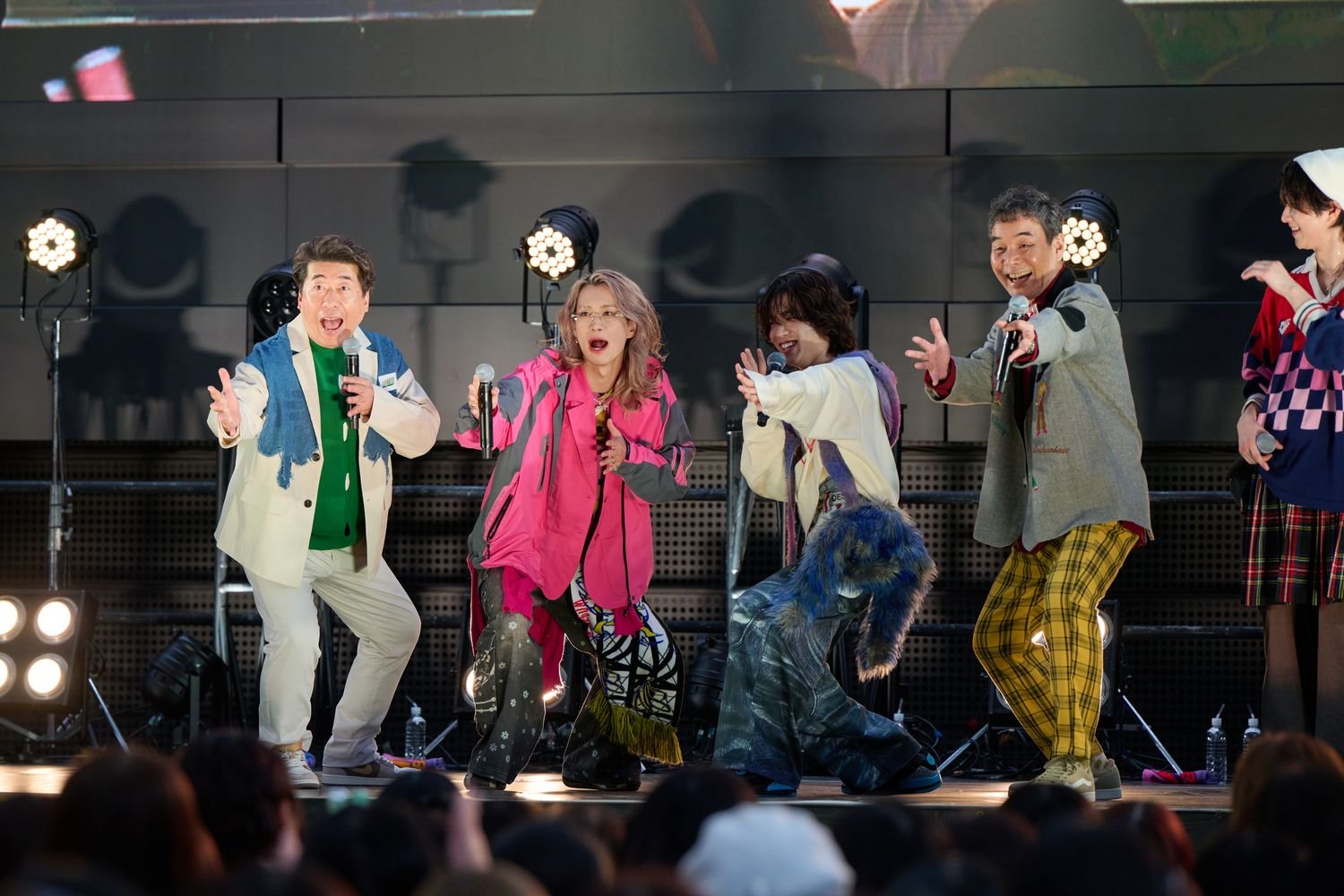 未来への期待と決意の籠もった楽曲を届け、FUMINORIがMORRIEとSHOOTを呼び込むと、なんとダチョウ倶楽部の肥後克広と寺門ジモンがステージに乱入。アルバムリード曲の「#KISSYOU」について、肥後は「ケンカしてチューという僕らのギャグを元に生まれた曲だと聞いてますよ」と語り、「『#KISSYOU』をやるならケンカしてチューをやらないといけない!」と主張してみせる。そこでメンバーは「じゃあ、俺が!」と次々に立候補し、最後にFUMINORIが「じゃ、俺やりますよ」と手をあげると、全員に「どうぞどうぞ!」と譲られる天丼芸が展開。結果「普通はやらないんです!」と固辞するFUMINORIに「ビジネスとして、エンターテイメントとして!」と肥後が迫り、「エンタメにも限界がありますよ!」と反抗しながら最後は2人でキス! 客席からは悲鳴のような歓声があがり、FUMINORIは「メチャメチャやわらかかった。なんでこんなにドキドキしてるの!?」と照れまくった。
