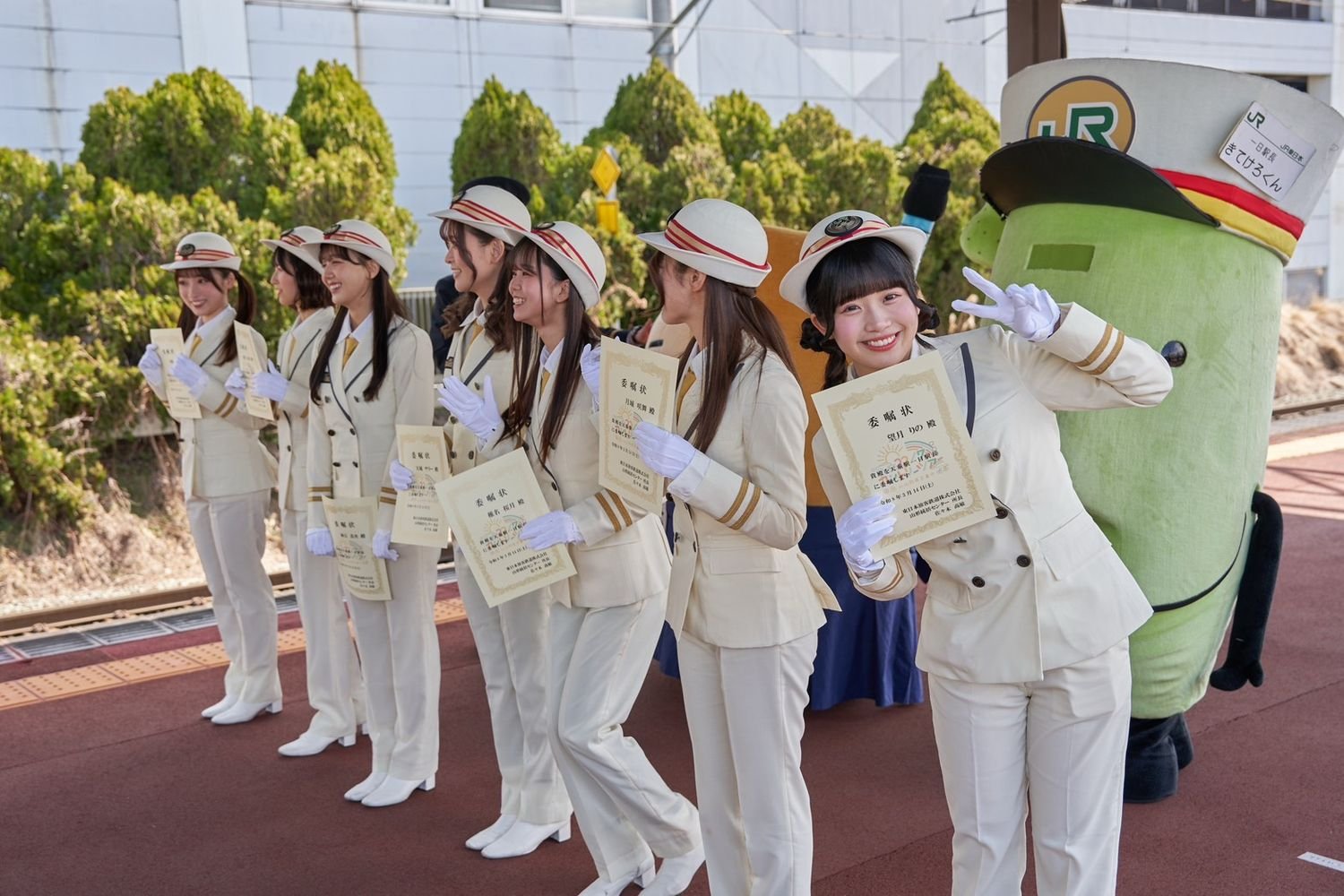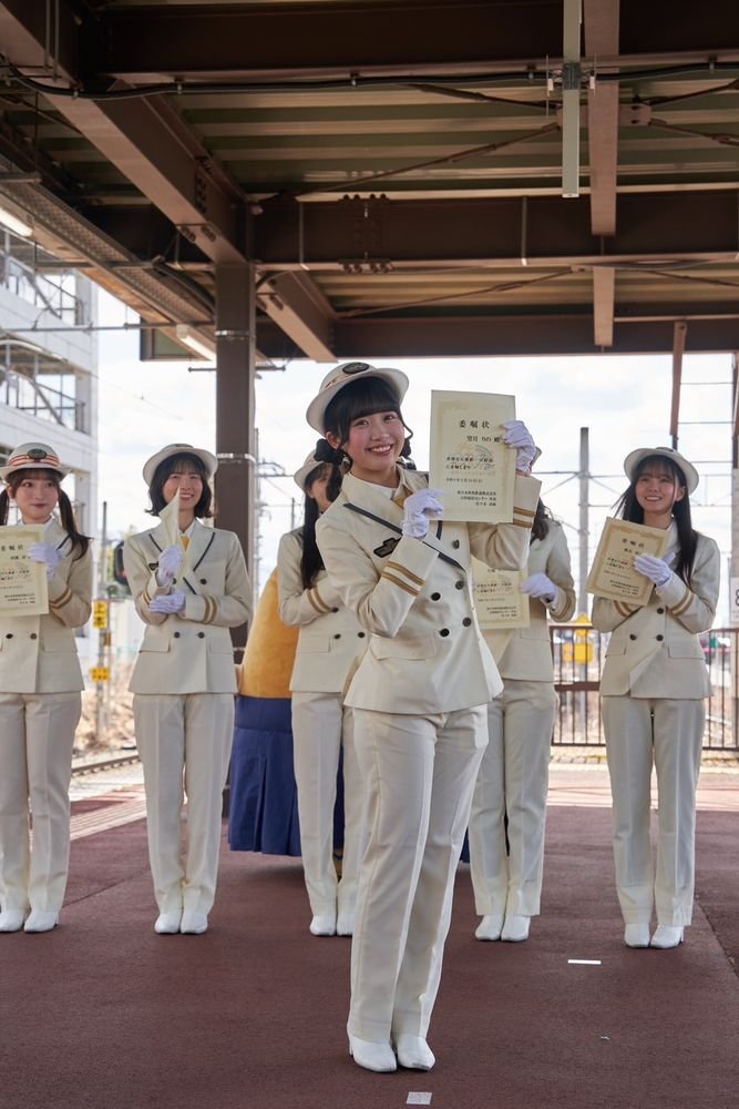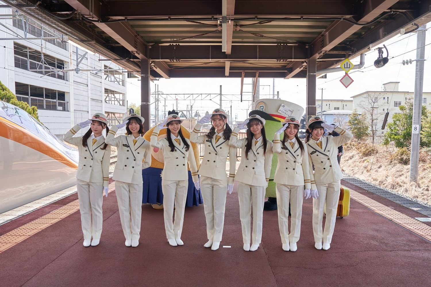 当日は、東京駅から天童駅まで、山形新幹線つばさ号の3車両を貸し切り、ファン参加型のツアーを実施。天童駅のホームには約200名のファンが集まり、相川奈央、麻丘真央、天城サリー、河瀬詩、椎名桜月、月城咲舞、望月りのの7名がホームで出迎えると、そのままJR天童駅一日駅長就任式が執り行われました。