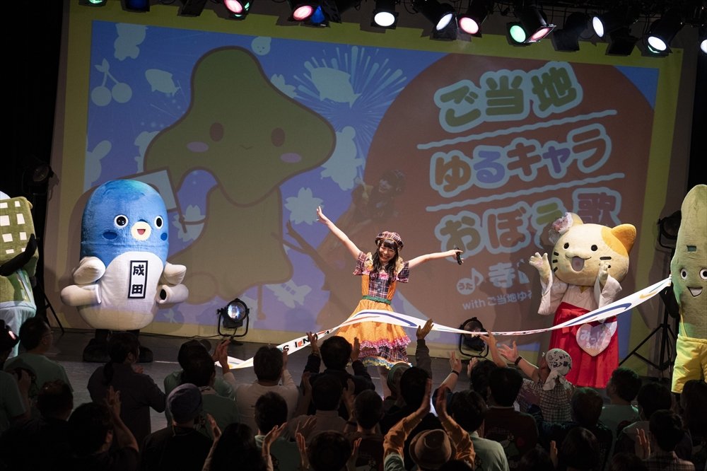 なんとこの大長編フル歌唱を見届けようと、寺嶋の盟友・大阪府枚方市のゆるキャラ「みっけ」がサプライズ登場。通常20分ほどが活動限界とされるゆるキャラが、40分超えの楽曲を見届けようと駆けつけた熱い友情に、早くも会場は感動モード。しかし、神妙な決意の挨拶と共に始まったチャレンジは、冒頭の北海道パート中盤で早々にミス。続く2回目の挑戦でも北海道パートでミスをしてしまい、「北海道から出られない」との迷言も飛び出した。それでも、さすがはかつて、杜撰なアイドルフェスをポジティブに楽しみつくし、「淡路島の女王」と呼ばれたソロアイドル。並外れた精神力で気を取り直すと、3度目の正直、順調に北から南へ歌い継いでいく。東北パートでは岩手県府内村のゆるキャラ「昆布ブラザーズ」、南関東パートでは千葉県成田市「うなりくん」が登場するなど、ゆるキャラたちからの応援も会場を盛り上げる。手拍子やガヤで応援しながら、キャラクターの名前が歌われるたび、キャラ名をコールして盛り上げる寺嶋のファン・通称「ゆふぃすと」たちの体力も素晴らしい。そしてついに、最終パートである、海外のキャラたちの紹介パートへ辿り着くと、「昆布ブラザーズ」、「うなりくん」も再登場し、序盤からフルで踊り続けた「みっけ」とともに、ラストスパートへ。ゆるキャラ、そして観客の見守る中、寺嶋は見事ノーミスフル歌唱を達成し、昆布ブラザーズの持つゴールテープを切った。