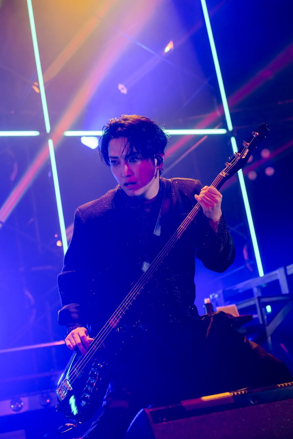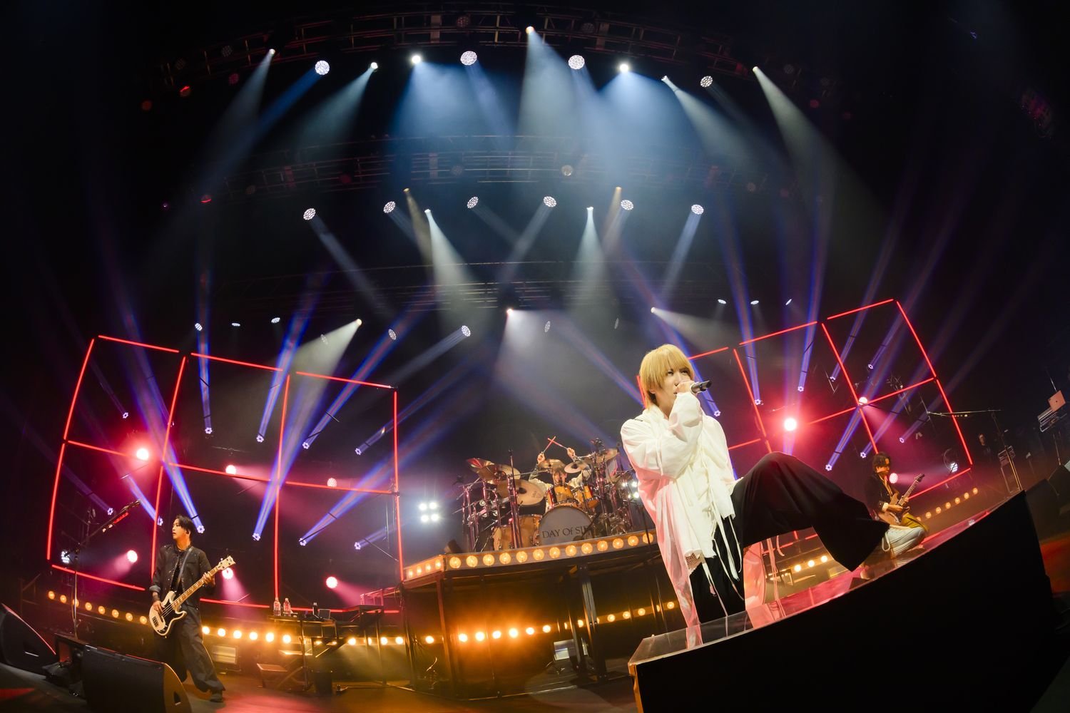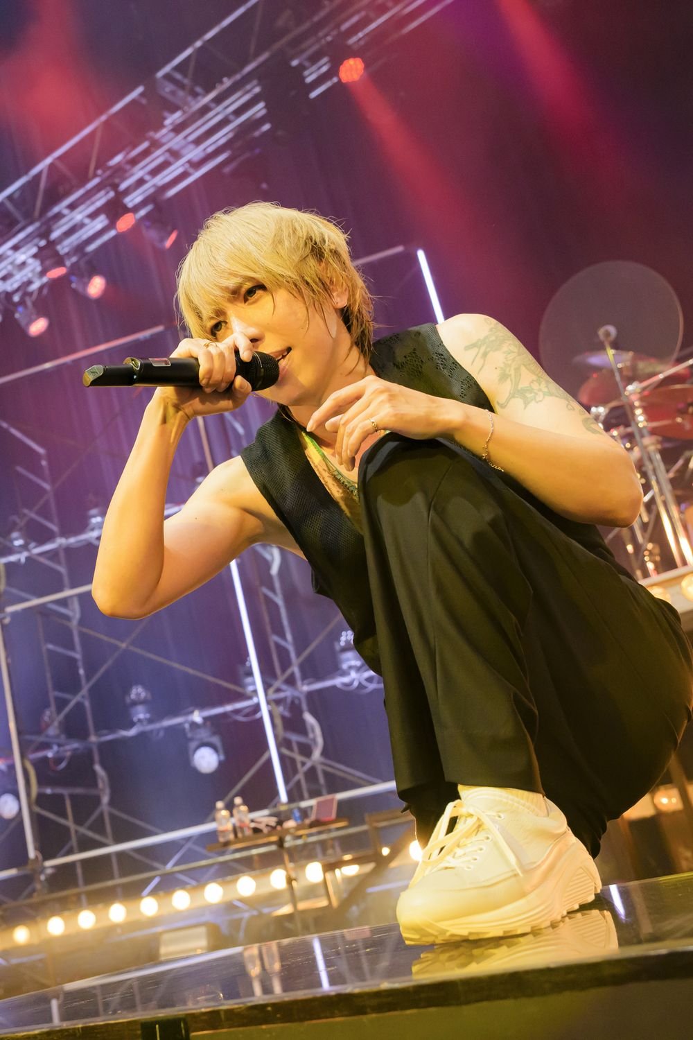 ゆうや、明希、ShinjiによるInstは、三者三様、自由自在にプレイしつつも互いの音に触発されて昂っていく演奏に、ロックバンドとしてのシドの骨格、礎の強さを再認識させられた。そこへ、前半は白いシャツ姿だったマオが黒いジャケットをまとって再登場して合流すると、「delete」がスタート。煽り文句もメンバーの動きもどんどん衝動的に、激しくなっていく。「盛り上がってんな、まだ行けんだろ? 行きたいんだろお前ら?」とマオが焚きつけて歌い出したのは「ほうき星」。ファンも大きな声でシンガロングする。カラフルな照明、ミラーボールも輝く中で「V.I.P」を披露。マオはShinjiへと歩み寄り肩に手を置いたかと思えば、後方の階段を上ってゆうやの隣へ。その後は明希の肩を抱きながら歌唱した。