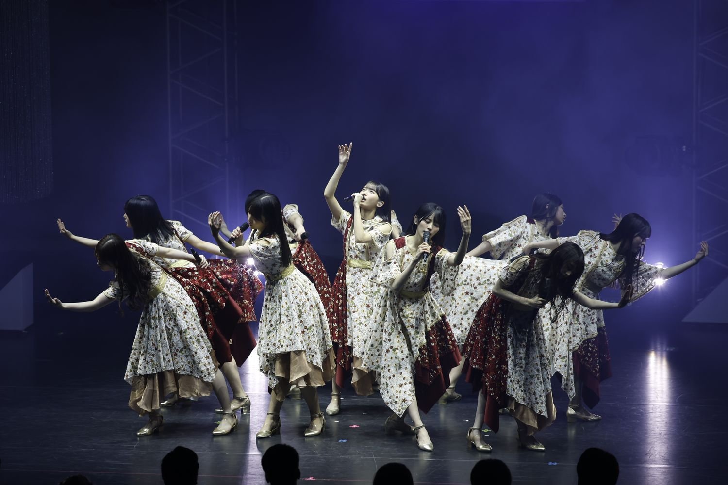 こうして、もうひとりの春組メンバーである海邉が「いつかできるから今日できる」をソロ歌唱。深みのある歌声で、この壮大な楽曲を丁寧に歌い紡いでいく。堂々と歌い終えた海邉が「今を大切に、信じていてください」とメッセージを残してステージを去ると、彼女と入れ替わるように愛宕、大越、鈴木、増田、森平麗心の5人で3期生楽曲「未来の答え」を元気いっぱいに披露。また海邉、川端、瀬戸口、長嶋、矢田の5人は4期生楽曲「キスの手裏剣」を楽しげに歌い踊り、客席を柔らかな空気で包み込んでいく。再びステージに10人が勢揃いすると、川端をセンターに据え5期生楽曲「いつの日にか、あの歌を…」を歌唱。先輩メンバーが大切にしてきた期別曲を10人で表現するその姿は、グループの長い歴史や先輩たちの熱い思いを体に染み込ませているようにも見えた。そして、グループの大切な局面で歌い継がれてきた「設定温度」にて、この期別曲ブロックは幕を下ろした。