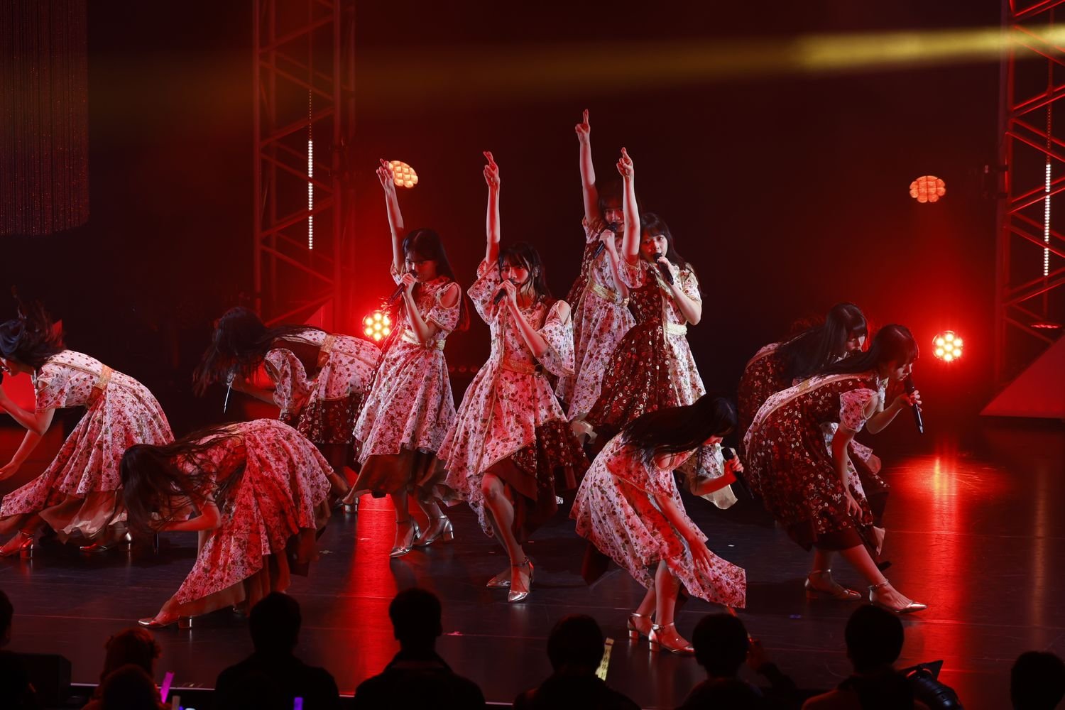 10人の息が合ったダンスで場の空気を変えると、大越をセンターに迎えた「ごめんねFingers crossed」でライブも終盤戦に突入。クールな側面を強く打ち出した同曲から、矢田が中心に立つ「Same numbers」でもこの空気は引き継がれていく。そして、メンバーが横1列に並び深々とお辞儀をすると、「きっかけ」へと突入。1人ひとりが胸に抱えるものを発露するように紡がれる歌声は、会場を彩り豊かに染め上げていった。