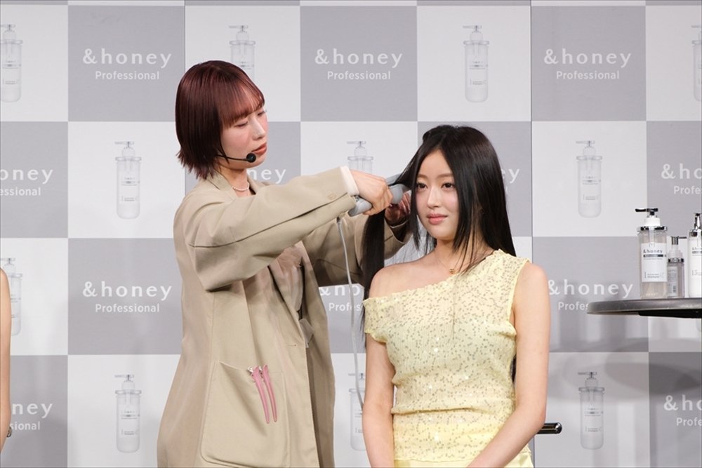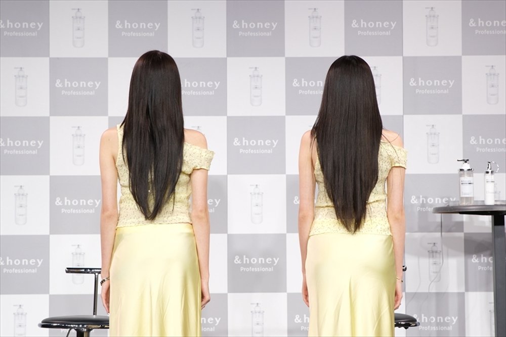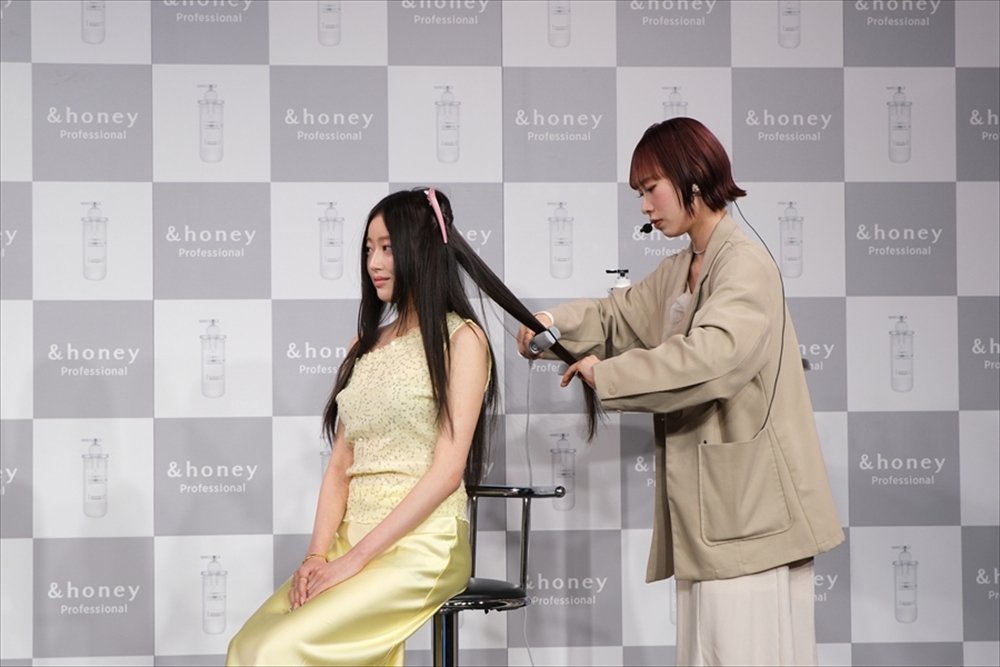 はんなみいなの二人はすでに「&honey Professional」のシャンプー・ブースターヘアトリートメント・ヘアトリートメントを使用し、ベースのケアだけでもしっかりとしたまとまりとツヤ感が出ている状態で登場。そのうえで今回のデモンストレーションでは、さらに仕上がりの質感を高めるアイテムとしてヘアオイルを2名のモデルのうち、みいなにだけ使用。二人の仕上がりにどのような違いが出るか注目が集まった。