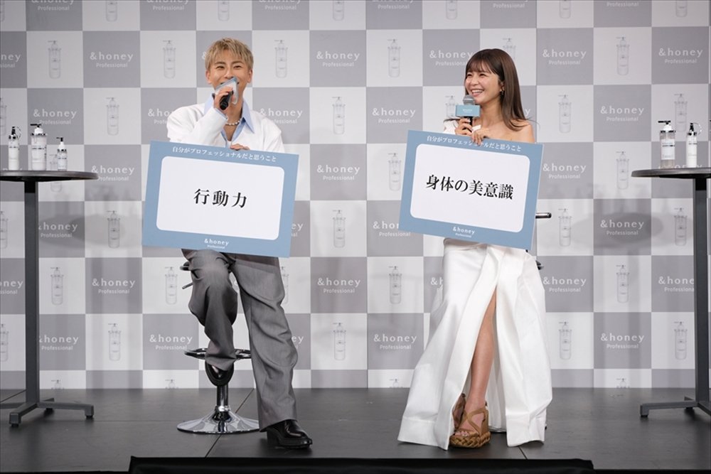 次に、今回の新商品はプロフェッショナルシリーズということで今までの&honeyからガラリと雰囲気が変わったことに、最近変わったモノやコトについて聞かれると、與は「ノマド生活を始めて、世界をぐるぐる回って自由な生活をしています。最近はメキシコにも行って、友人たちと音楽フェスを観に行きました」とコメントした。宇野は、「今までハイトーンだったのですが、皆さんに潤い髪を見せたくてダークトーンにしてきました。」と回答し、実際にサラサラでツヤのある髪の毛を来場者の前で披露し、会場の注目を集めていた。普段のヘアケアの方法や毎日ルーティーンで行っていることについて聞かれると、宇野は「スキンケアも調子に合わせて変えると思うのですが、髪もその日のコンディションに合わせて向き合って変えるようにしています。髪を結ぶ時も柔らかいシュシュ(髪留め)にしています。」と回答した。