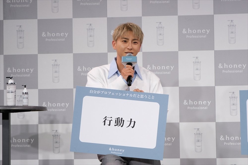 まず初めに実際に「&honey Professional」シリーズを使用した二人に対して、使ってみての率直な感想について質問。與は率直の感想として「最近、ご覧の通りヘアカラーを明るく変えたんですが、そんな髪にも使い心地が良かったですね。」とコメント、宇野は「毎日、自宅でプロフェッショナルなケアができるってありがたいですよね。すごい潤っているなと実感しています」と語った。