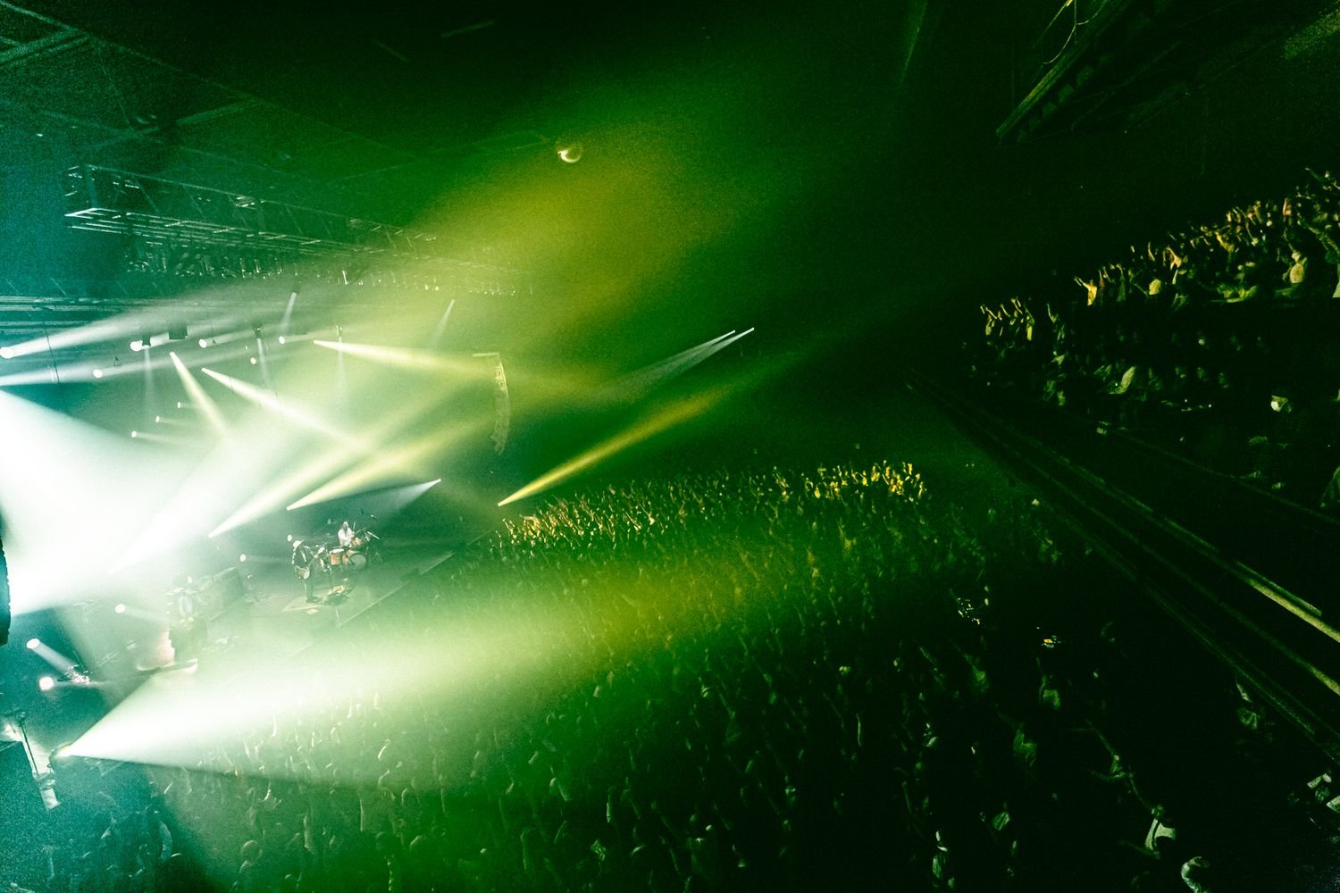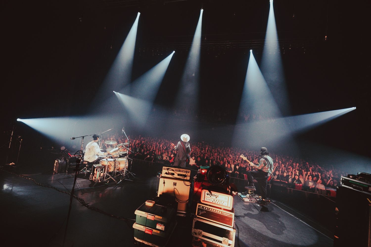 4月9日、KT Zepp YOKOHAMAで〈ACIDMAN LIVE TOUR“光学”〉の幕が開いた。13枚目の最新アルバム『光学』は、円熟と初期衝動を併せ持つ圧巻のバンドサウンドと、大木伸夫(Vo&G)が長年追求し続けてきた思想――宇宙論と生命論――の粋と言える歌詞世界を提示する、壮大なコンセプトアルバムだ。昨年12月に大阪・東京の2会場で開催された「アルバム全曲初披露ライブ&第2回壇上交流会」で、その全容に圧倒されたのは記憶に新しいが、ツアーではさらに熟成を進めた音が聴けるはずだ。1階フロアは満員、2階席のてっぺんまで期待感と緊張感がみなぎっている。