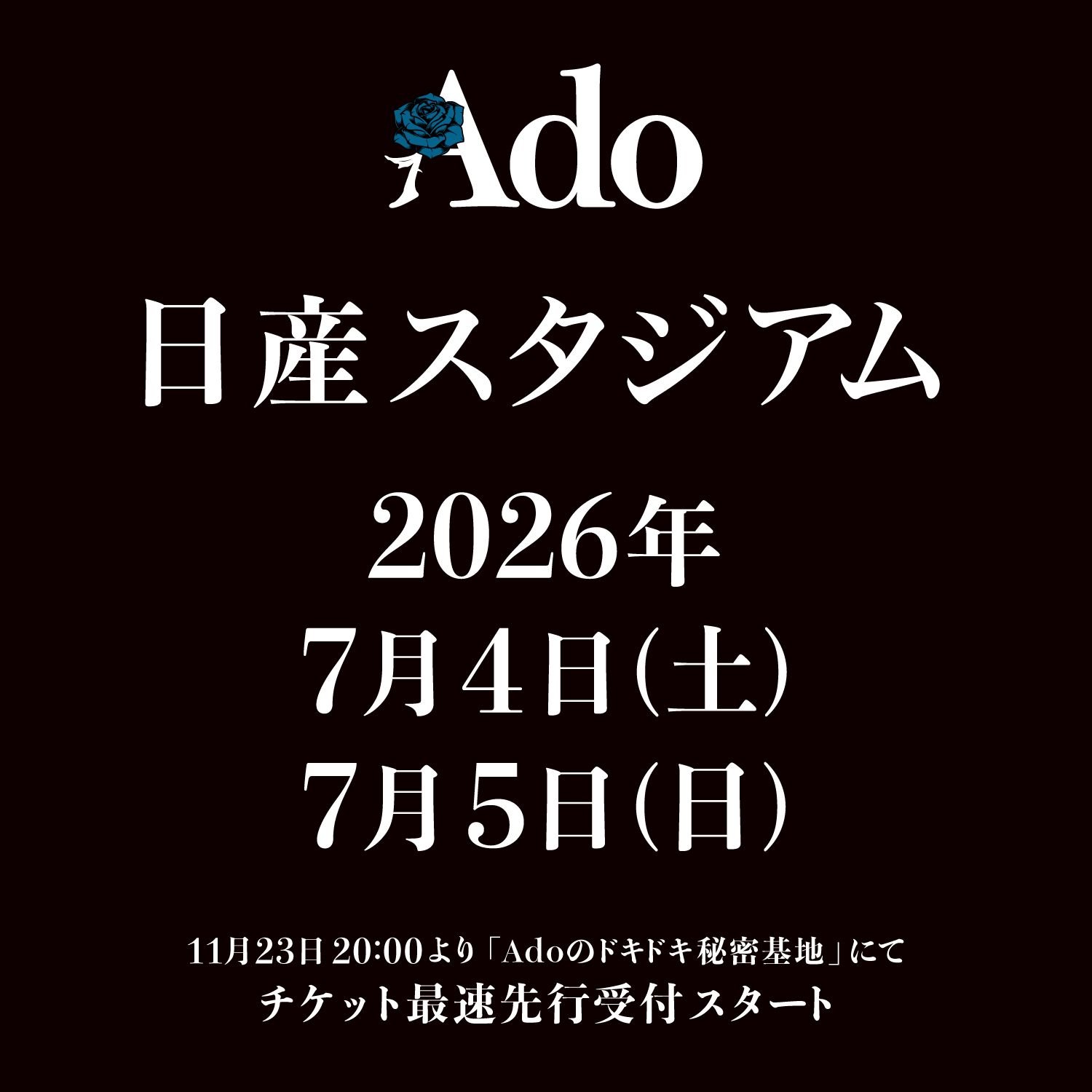 2020年10月に「うっせぇわ」で鮮烈なメジャーデビューを果たし、今年2025年で5周年イヤーに突入した歌い手Adoが、2026年7月4日(土)、5日(日)に日産スタジアムライブを開催することが決定した。今年、自身2度目のワールドツアー『Ado WORLD TOUR 2025 “Hibana” Powered by Crunchyroll』と初のドームツアー「よだか」を完遂したAdoの次なるステージは日産スタジアムとなる。「Adoのドキドキ秘密基地」にてチケット最速先行受付がスタートしたので、是非チェックしてほしい。