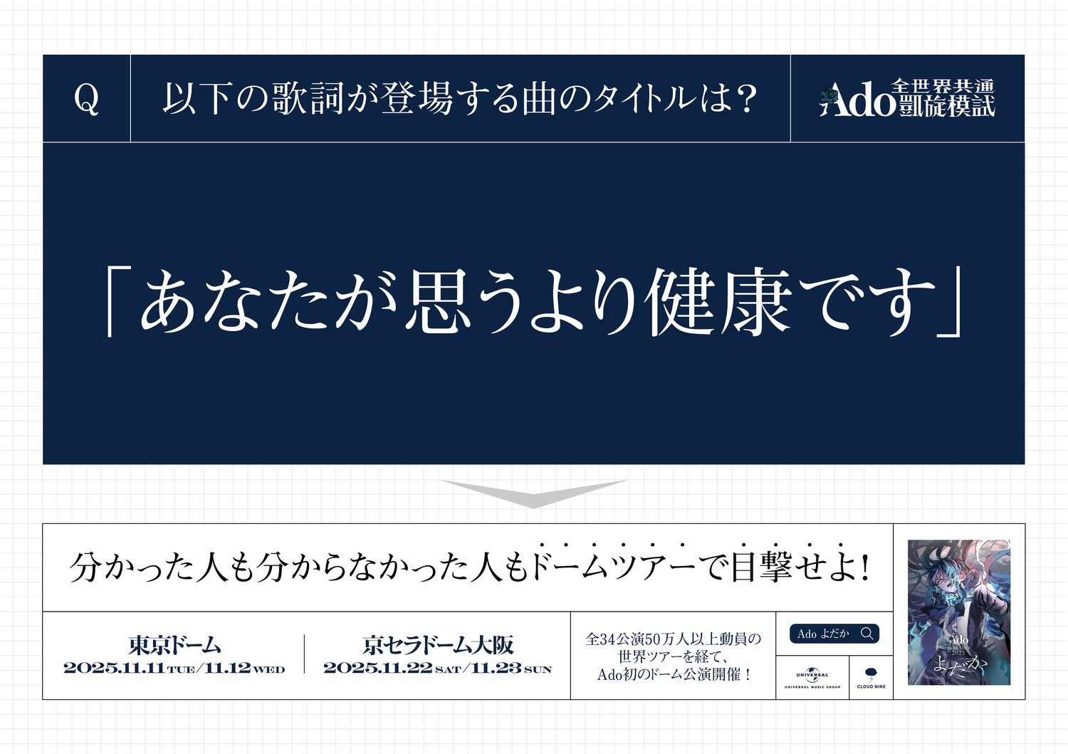 2020年10月「うっせぇわ」での鮮烈なメジャーデビューから、今年2025年で5周年イヤーに突入し、自身2度目のワールドツアー『Ado WORLD TOUR 2025 “Hibana” Powered by Crunchyroll』を終えた22歳の歌い手Ado。凱旋公演となるドームツアー“Ado DOME TOUR 2025「よだか」”開催まで残り1ヶ月となり、新たな施策がスタートする。10月20日(月)より、「Ado全世界共通凱旋模試」の開催が決定。特設サイトにて実施されるので、全世界どこからでも参加可能。あなたのAdo力をぜひ、お試しあれ。さらに、東急電鉄、車内ドア横ポスターにも登場。