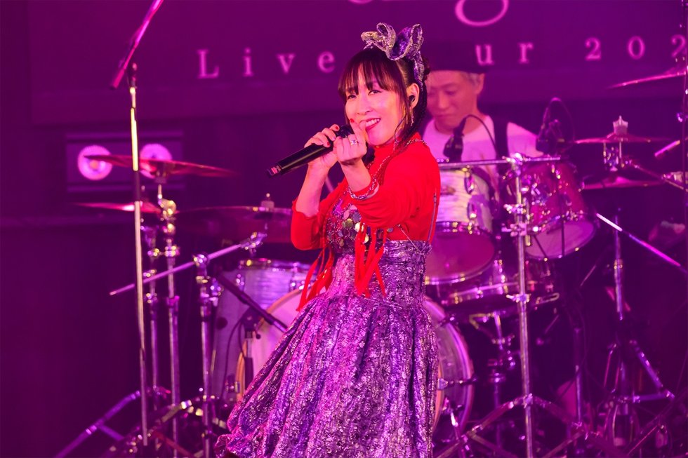 ポップな側面をさらに開拓した「乙女のルートはひとつじゃない!」の後は、ライヴではレアなトラック「未来とゆう名の答え」を披露した。これは2005年のアニメ『JINKI: EXTEND』のエンディング主題歌。MCでの解説によると、当時もがき苦しんでいたなかで表現した“未来”が、20年経って“今”になったという答え合わせになったという。耳に残る上下移動のメロディやキメタメのあるコーラスなど、ドラマティックな演出が多めの楽曲で、若々しい特徴が現れた楽曲を、現在の堂々とした歌いまわしで表現する。こうしたステージングもキャリアの答えの一つと言えそうだ。