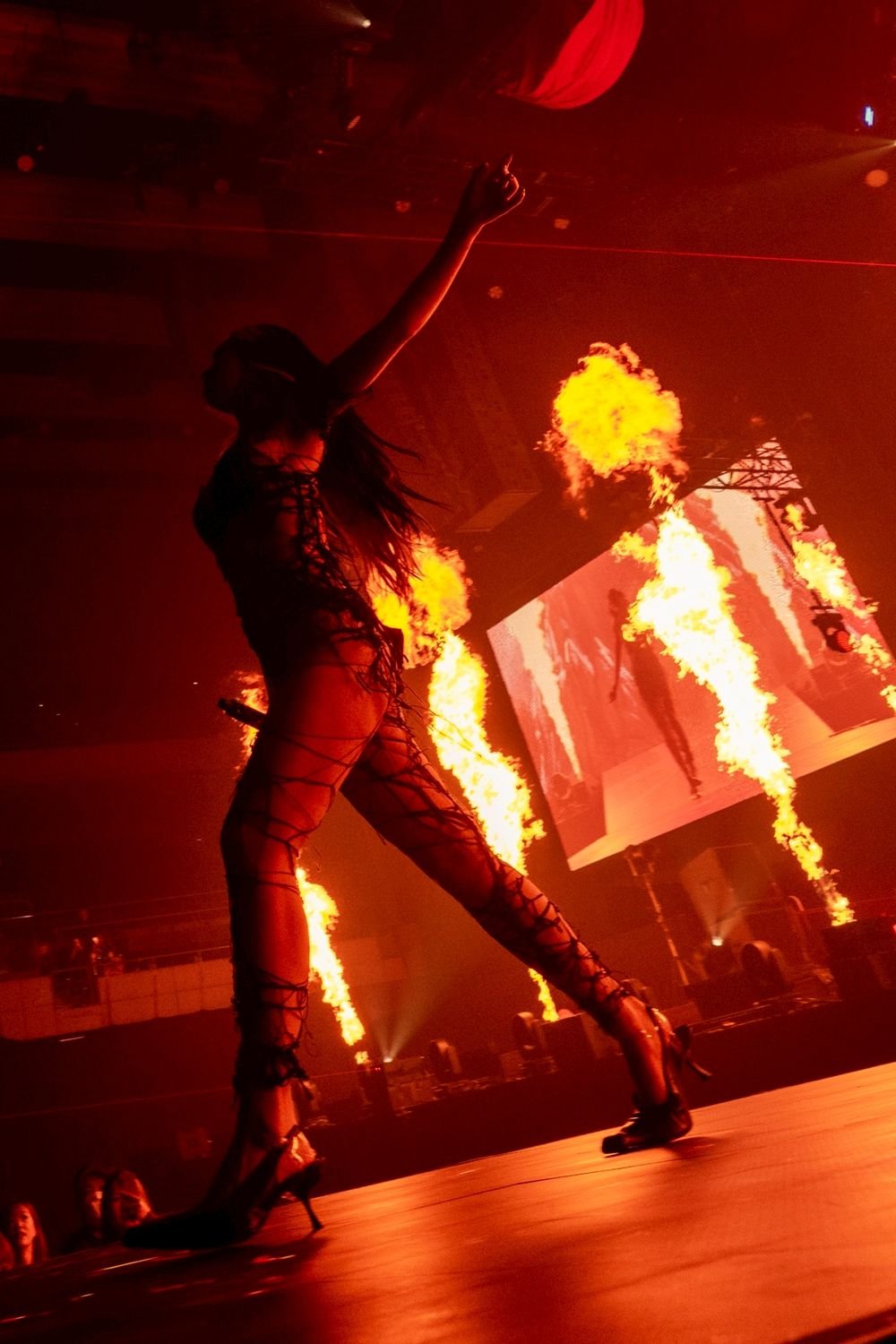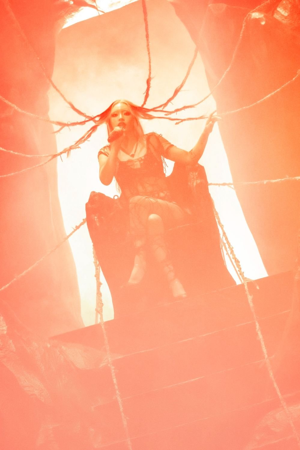 ライブ冒頭、ステージ上のスクリーンに黒雲や溶岩、大地から噴き上がるマグマといった不穏な映像が写し出される。幕が降りると、ステージには洞窟のようなセットが出現し、その中央に黒い衣装をまとって岩肌に鎮座するちゃんみなが登場。髪はメデューサのように四方に伸びて岩肌と繋がっている。