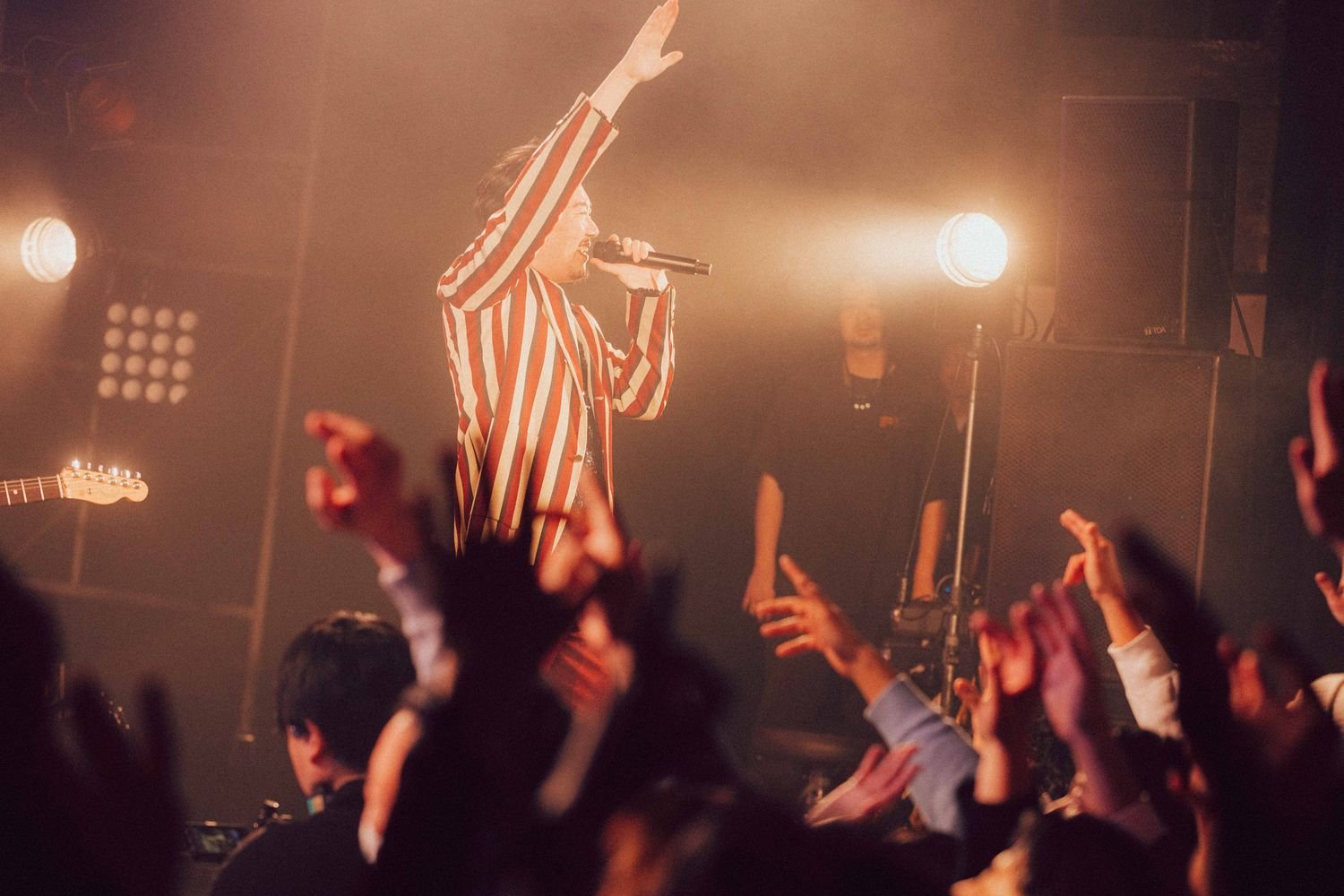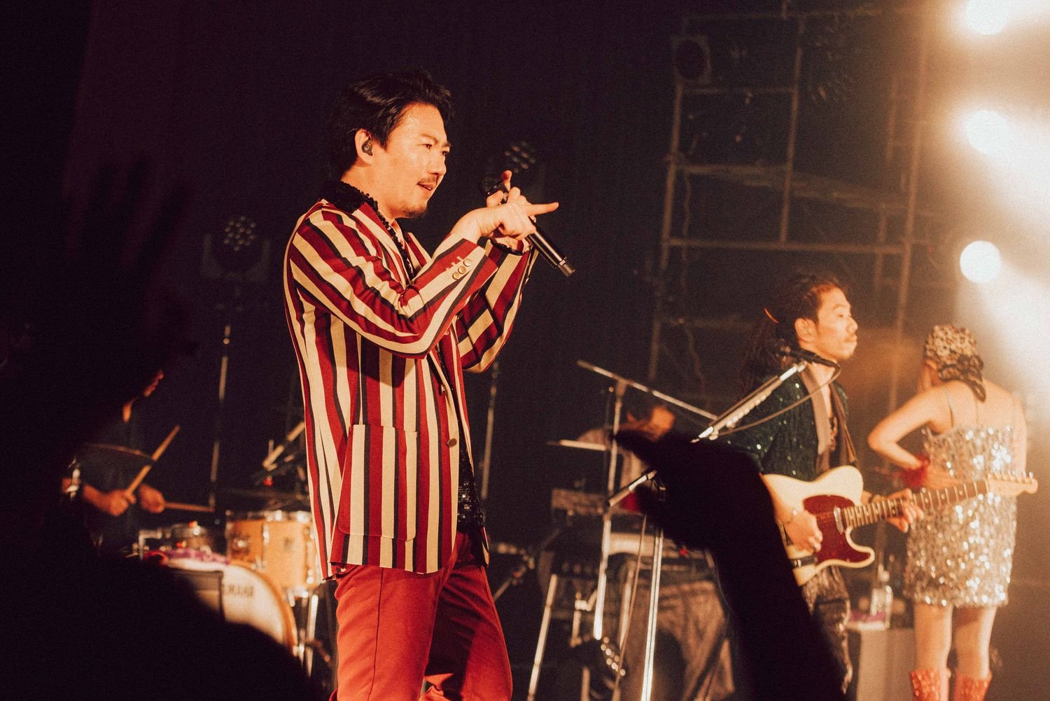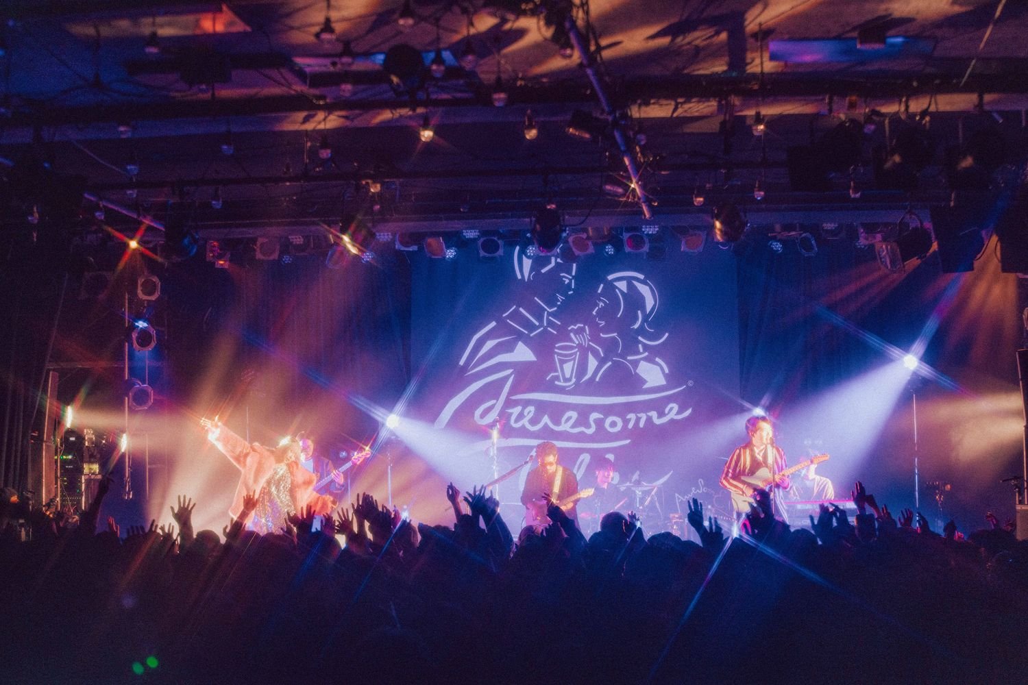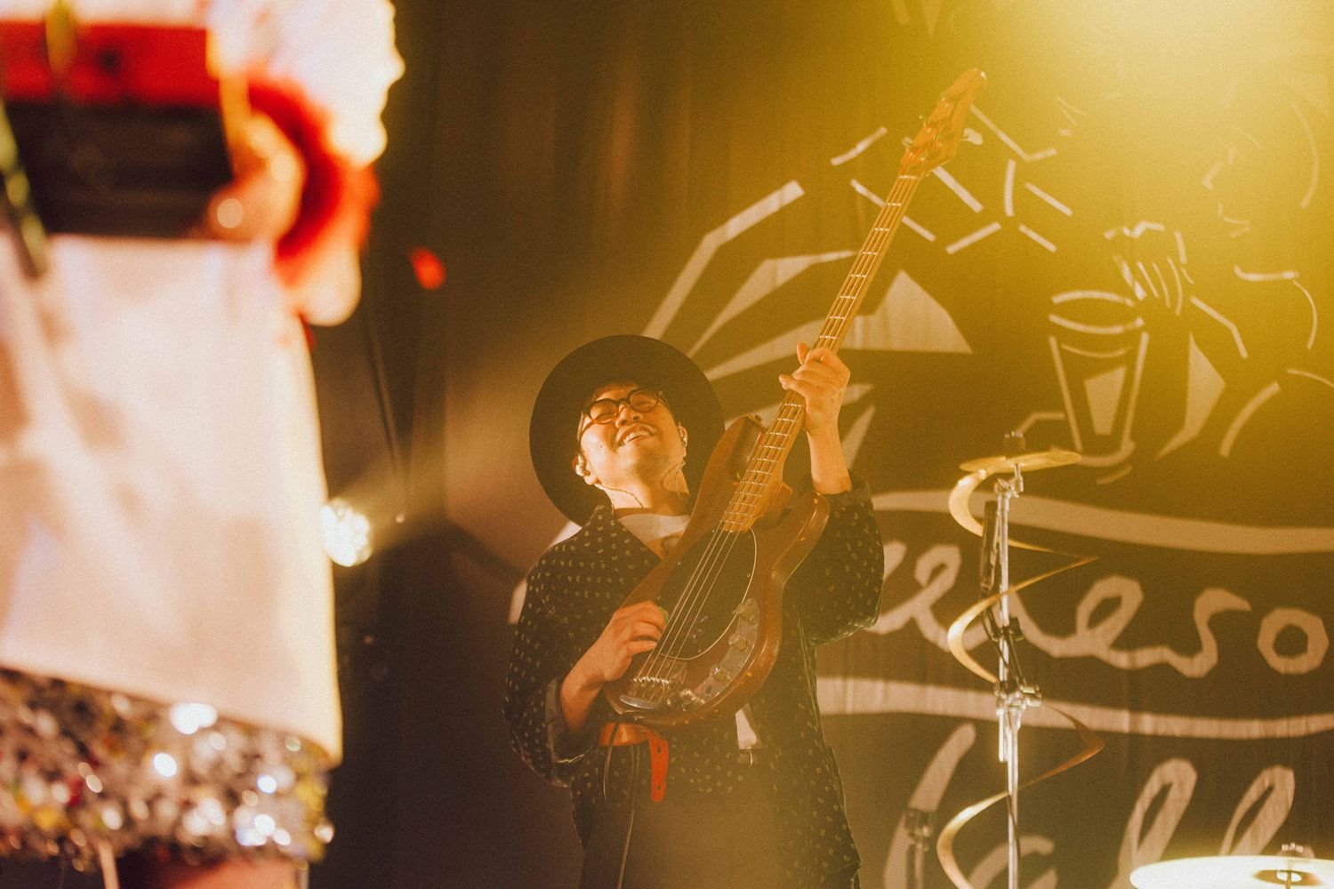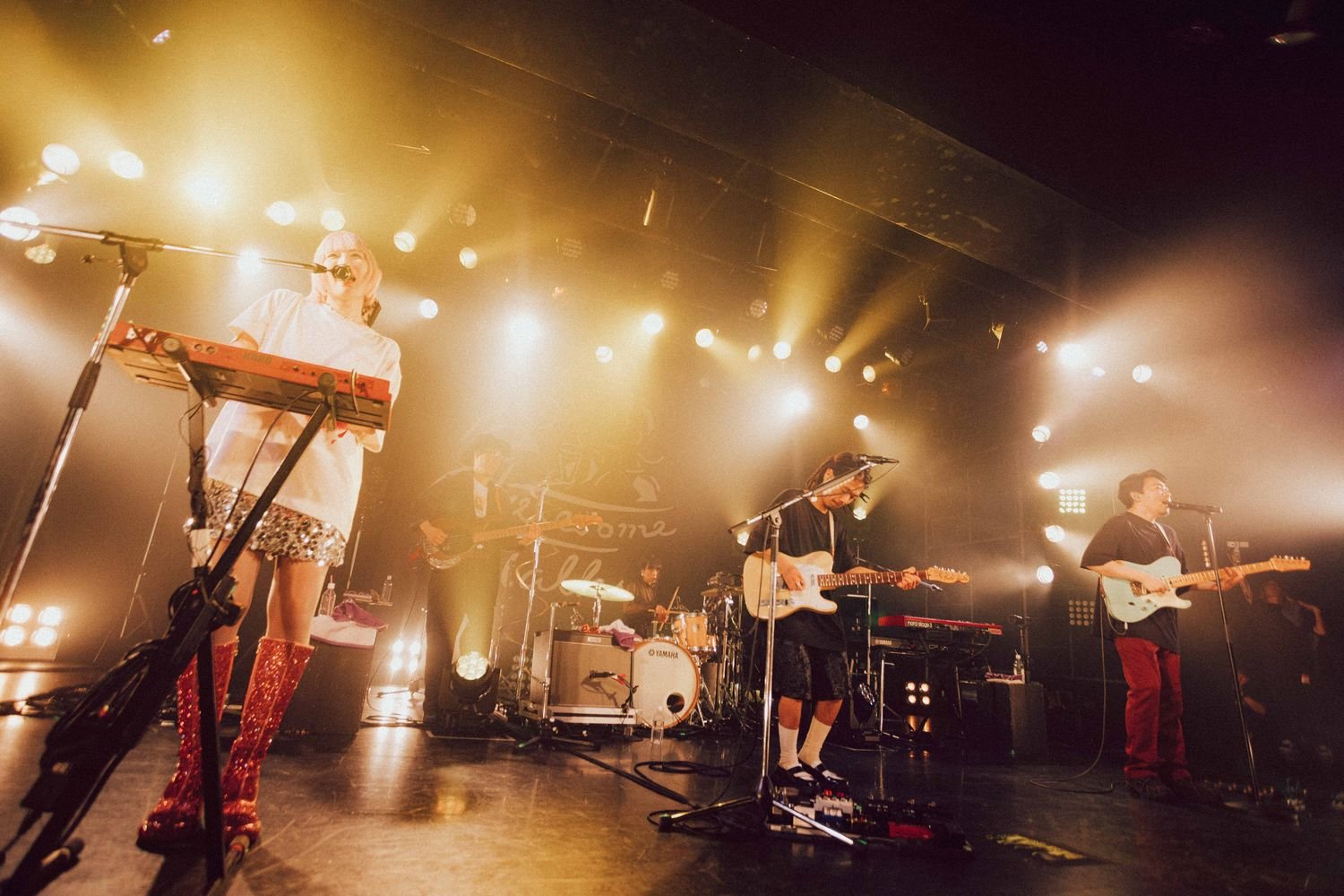 開演の合図とともに暗転すると、Flaming Lips“Race for the Prize”が流れる中、光が乱反射する衣装を身に纏ったatagi(Vo, Gt)、PORIN(Vo)、モリシー(Gt)が登場。活動休止前ラストライブの幕開けに選んだ楽曲は、“ファンファーレ”だ。《ああ 世界は美しい》《笑って 切ない気持ちはサヨナラさ》という歌詞が挨拶代わりに響く。その後のMCでatagiが「ぶっちゃけ活休前最後のライブって、どんなテンションで見たらええんやろうってお客さん自身も思っているんじゃないかなって思うんですけど、僕らが出している音や言葉、パッションを受け取ってくれたらいいな」という言葉があったが、笑顔で過ごす前向きな夜にしたいという意志が込められているオープニングだった。