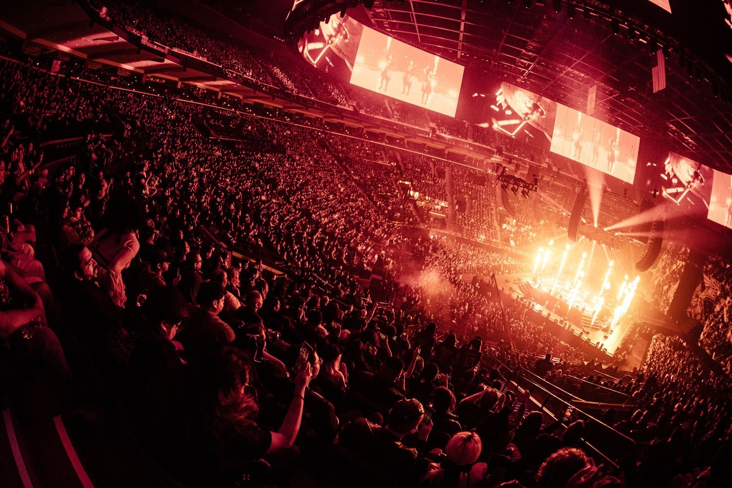 SOLD OUTとなったIntuit Domeの会場内には、『METAL FORTH』のアルバムジャケットのデザインにもなっている菱形のブラックホールを形どったセンターステージが設置され、エンドステージ側にはブラックホールが浮かび上がる巨大なMETAL FORTHの空間が広がっていた。さらにはステージおよび会場全体を360度囲むようなHALOと呼ばれるリング状の巨大なLEDスクリーンが天井から吊るされており、今回のスペシャルな公演に期待が高まる。