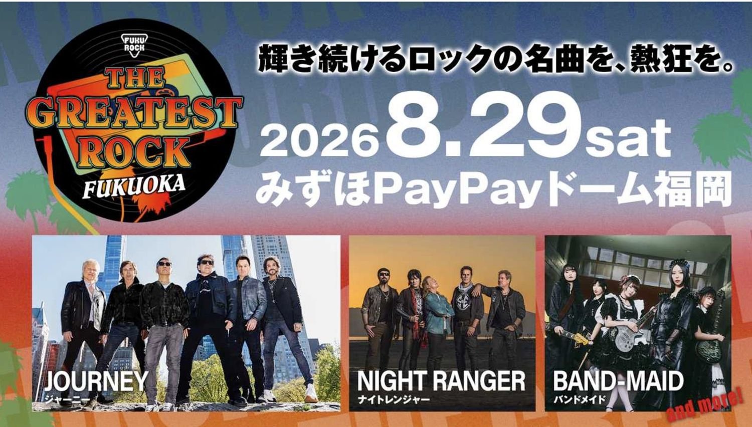 世界的人気のガールズロックバンドBAND-MAIDが、8月29日に福岡のみずほPayPayドーム福岡にて初開催される『THE GREATEST ROCK FUKUOKA』に出演することが発表された。BAND-MAIDと共に出演が発表されたのは、JOURNEY、NIGHT RANGERという、両組ともグラミー賞へのノミネート歴がある、世界的レジェンドアーティスト2組。「輝き続けるロックの名曲を、熱狂を。」というテーマで開催される本イベントでは、今後も日本の音楽シーンを代表するアーティストの出演が発表されるとのことだ。そんな中で、一組目の日本人アーティストとして出演がアナウンスされたBAND-MAIDには、多大な期待が寄せられていると言えるだろう。4月21日よりチケットの最速先着先行受付が開始するということなので、詳細はイベントの公式HPを確認だ。