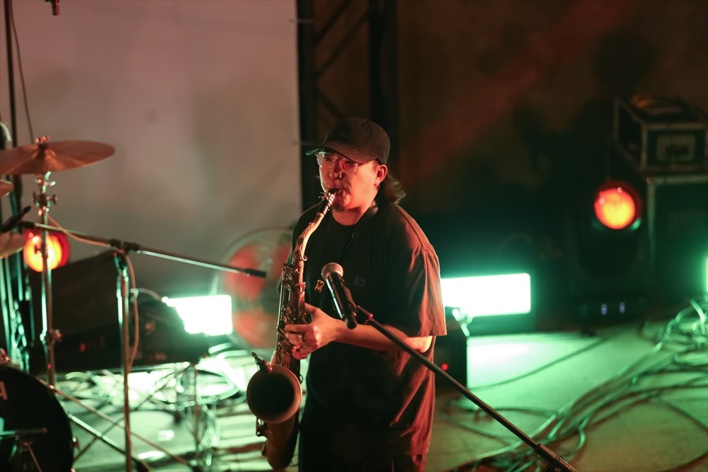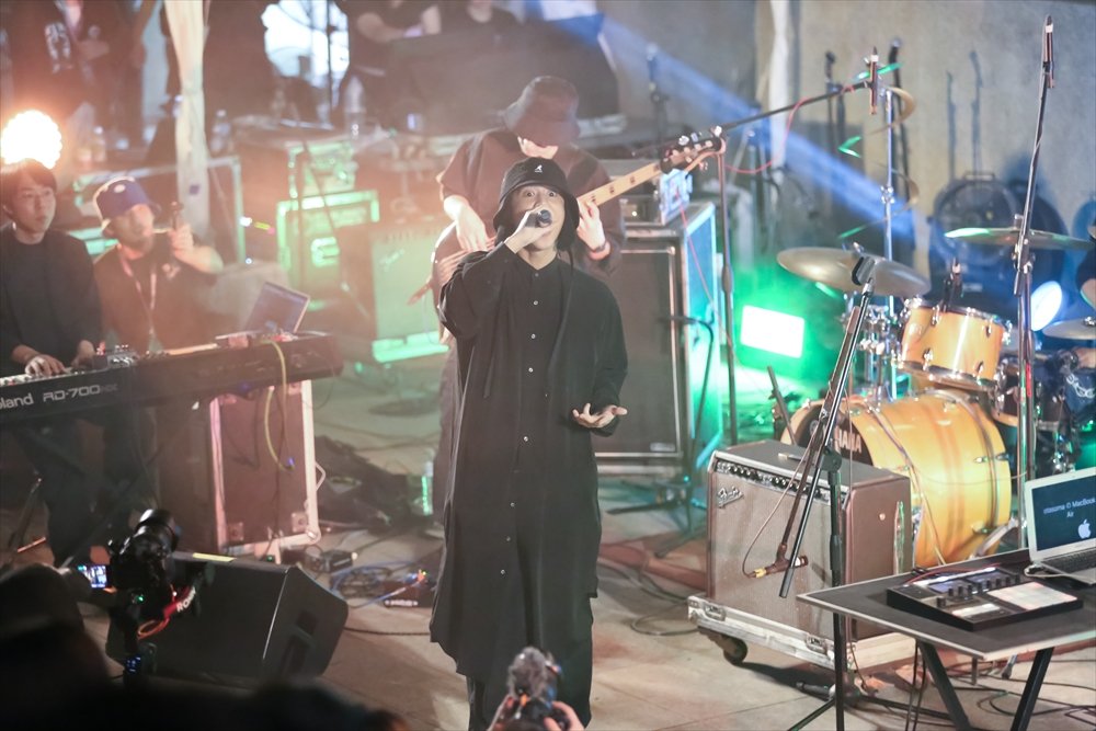 SOMAOTA は卓越したラップスキルを持ち、高音域の個性的な声と滑らかなフロウで、畳みかけるように言葉を連ね、観客を一気に引き込んでいく。一方、サックス奏者の Daiki Yasuhara は、バンドのジャズパートの要であると同時に、コーラスとしてラップを支え、ボーカルに奥行きと立体感を加えていた。