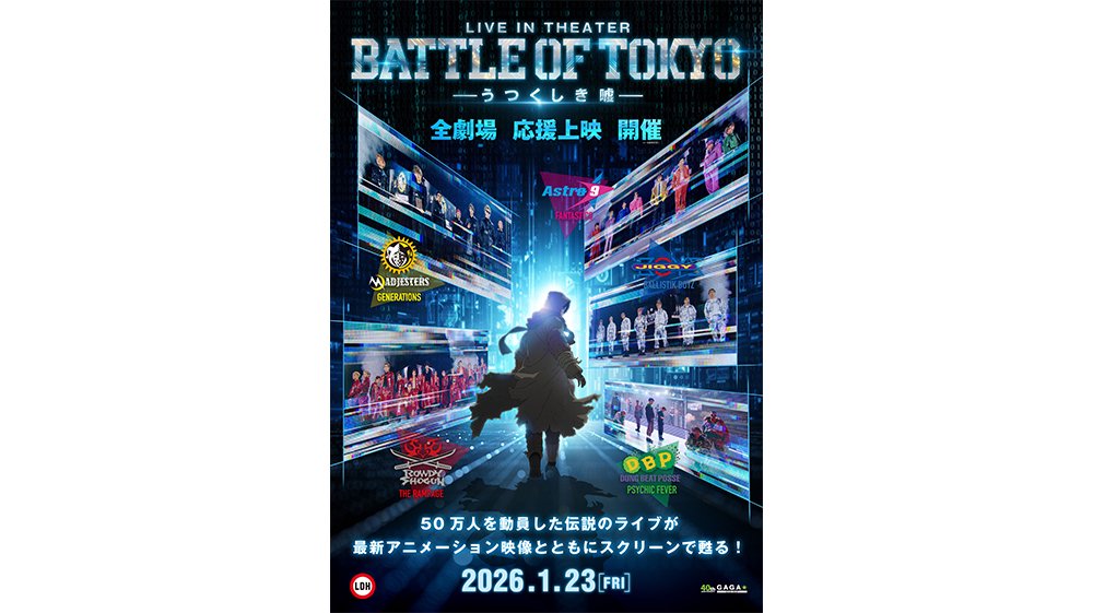 音楽ライブより厳選されたライブ楽曲映像とミュージックビデオをミックス再編集し、なおかつ、原作小説「BATTLE OF TOKYO」(角川文庫)で描かれている ―架空未来都市・超東京を舞台に特殊スキルを持つ若者達で結成された5チームの闘いと絆の物語― の新規エピソードを描いた最新アニメーション映像と融合させ、音響も5.1chサラウンドにリマスタリングされた、平沼紀久が監督を務めたLIVE IN THEATER『BATTLE OF TOKYO -うつくしき嘘-』が2026年1月23日(金)よりグランドシネマサンシャイン 池袋ほか全国ロードショー。全国すべての劇場で応援上映として公開される。